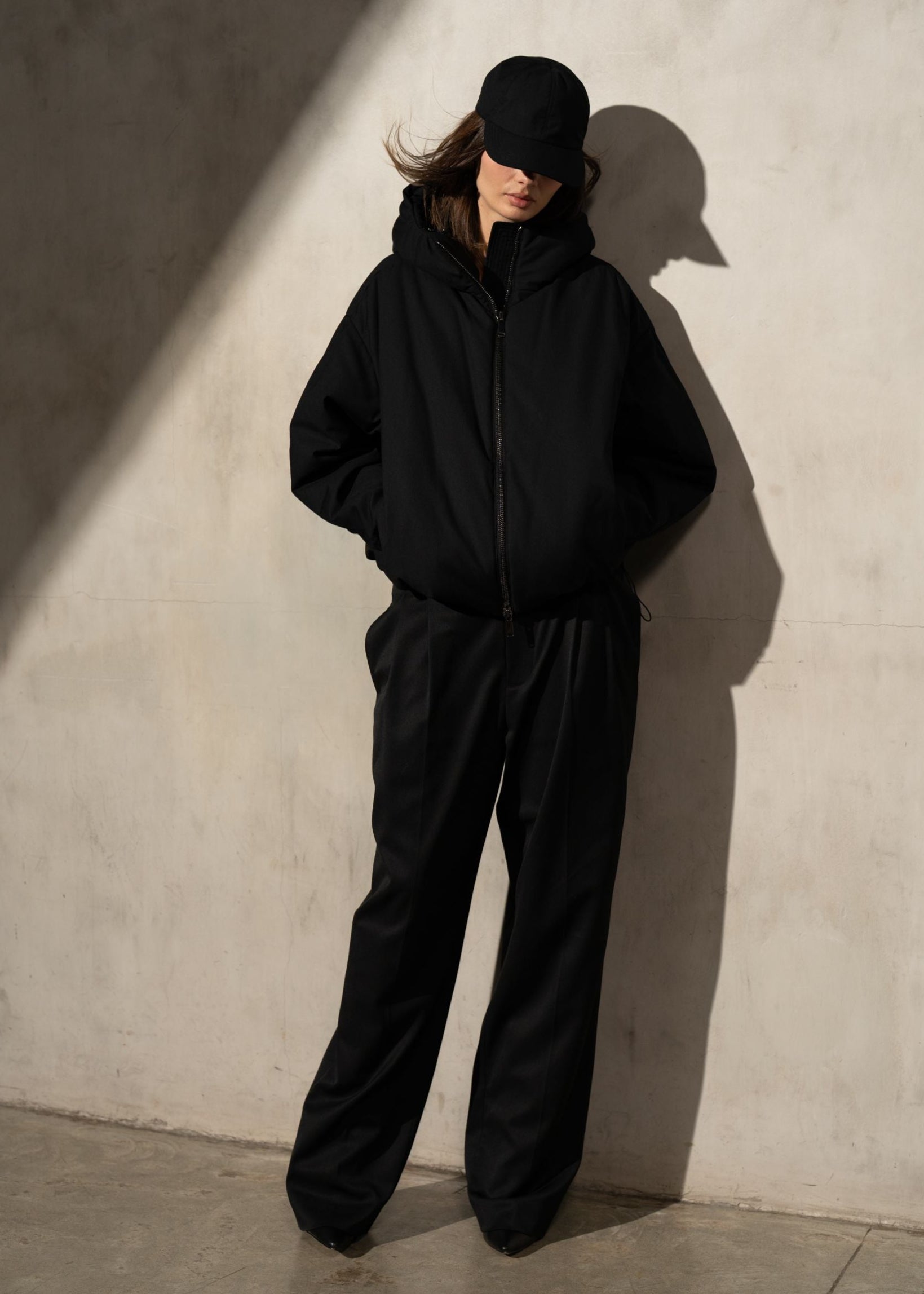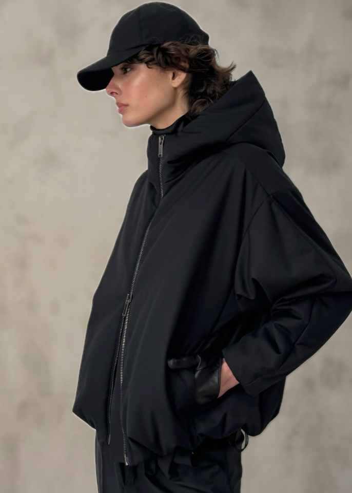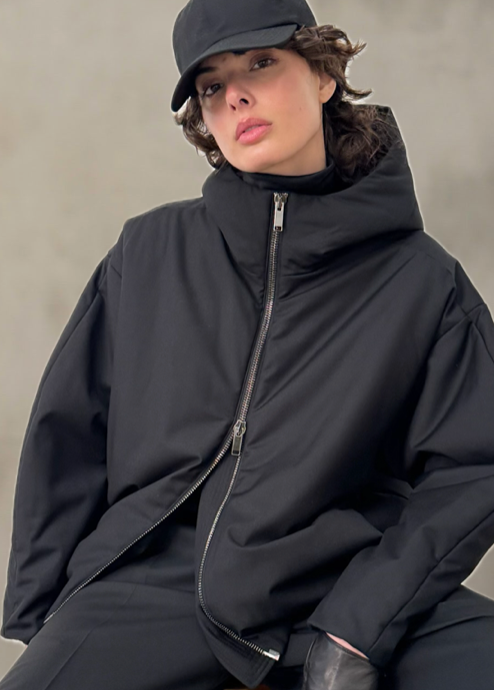 A modern, quilt-free down jacket crafted from Italian-made AUTER fabric. Sleek and sculptural with hood and oversized silhouette offering full water and wind resistant protection.