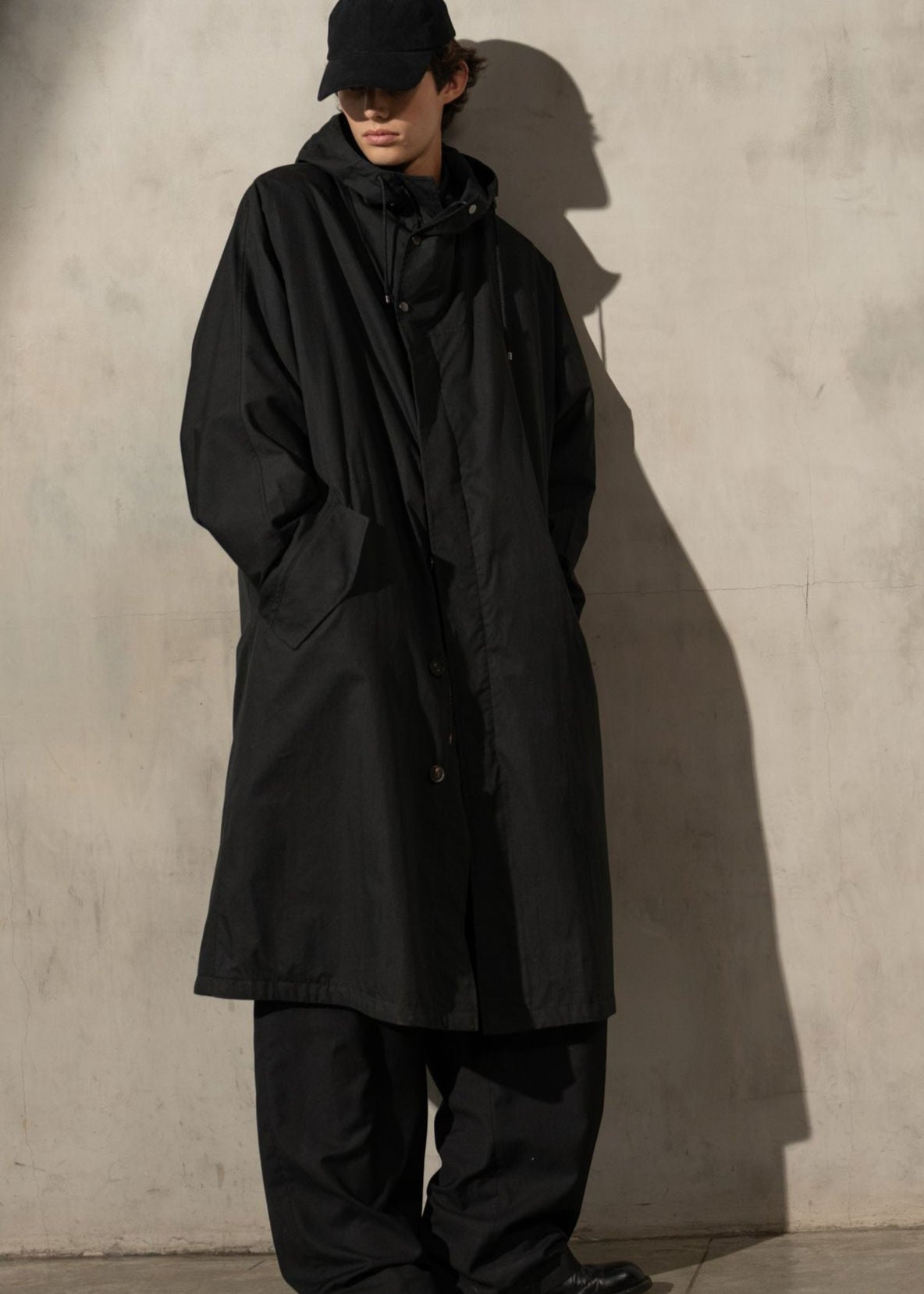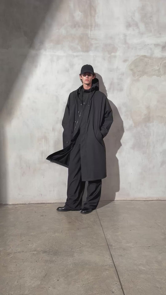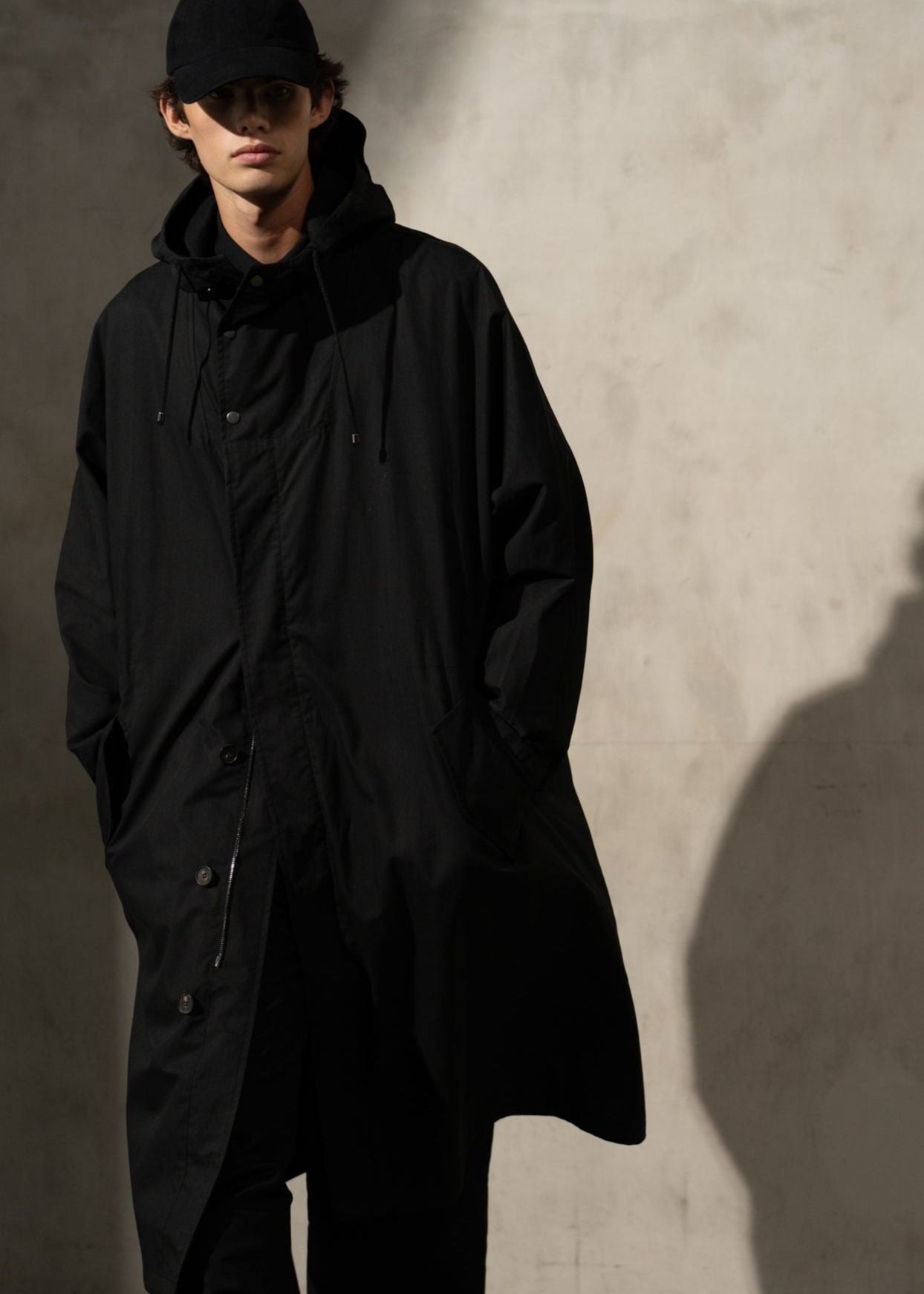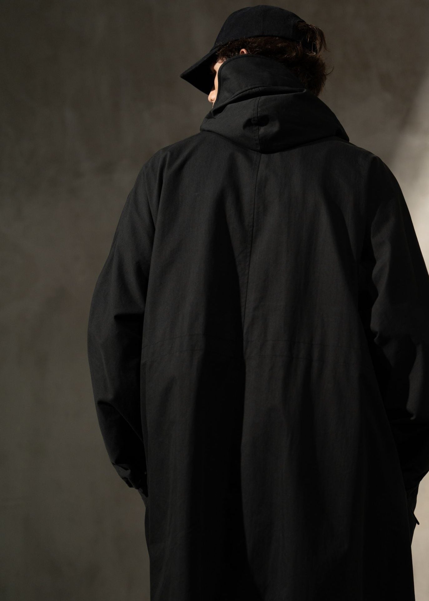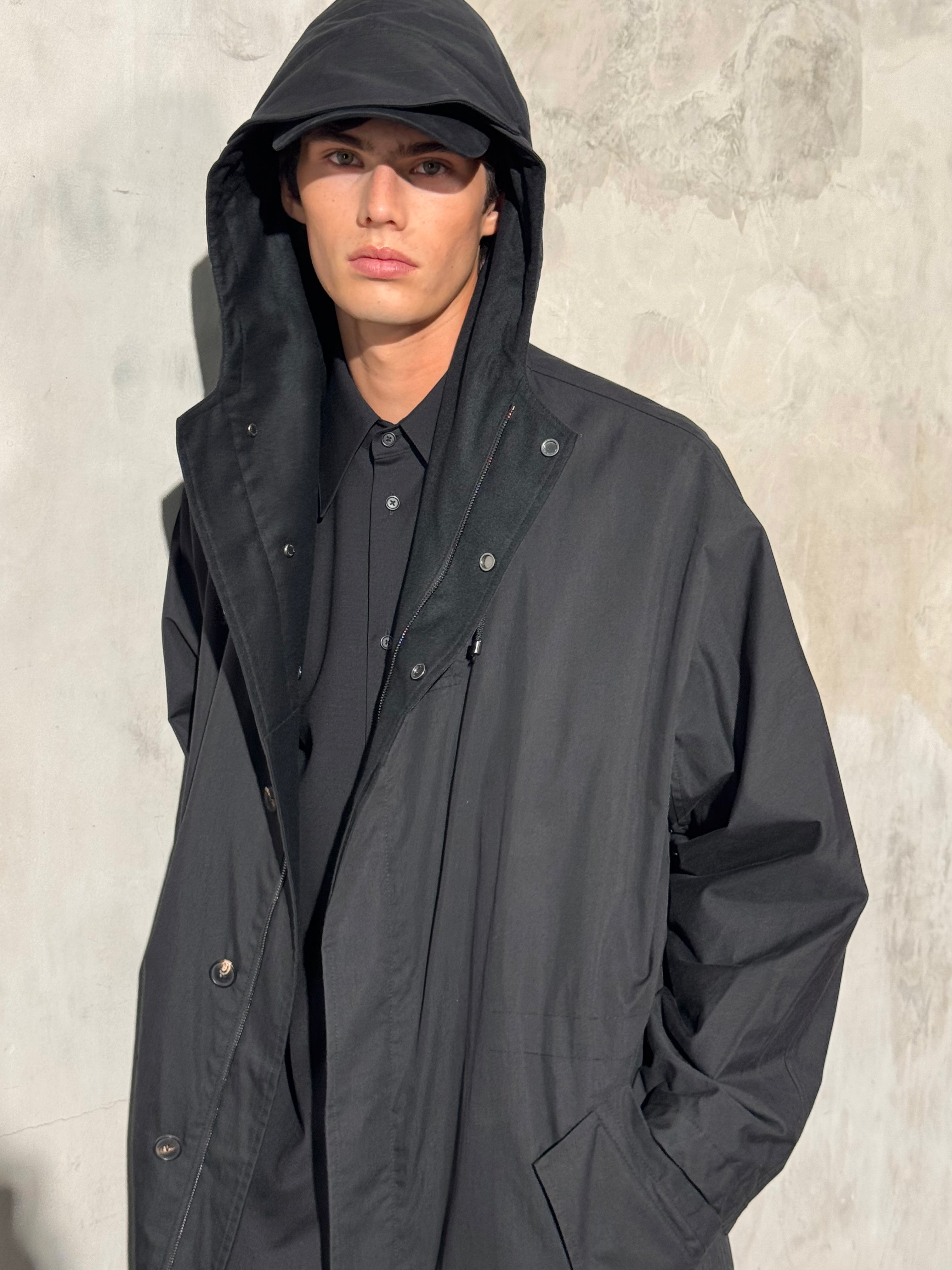 A long, water resistant parka designed in structured Italian cotton blend that exemplifies quiet luxury and elevated weather protection.