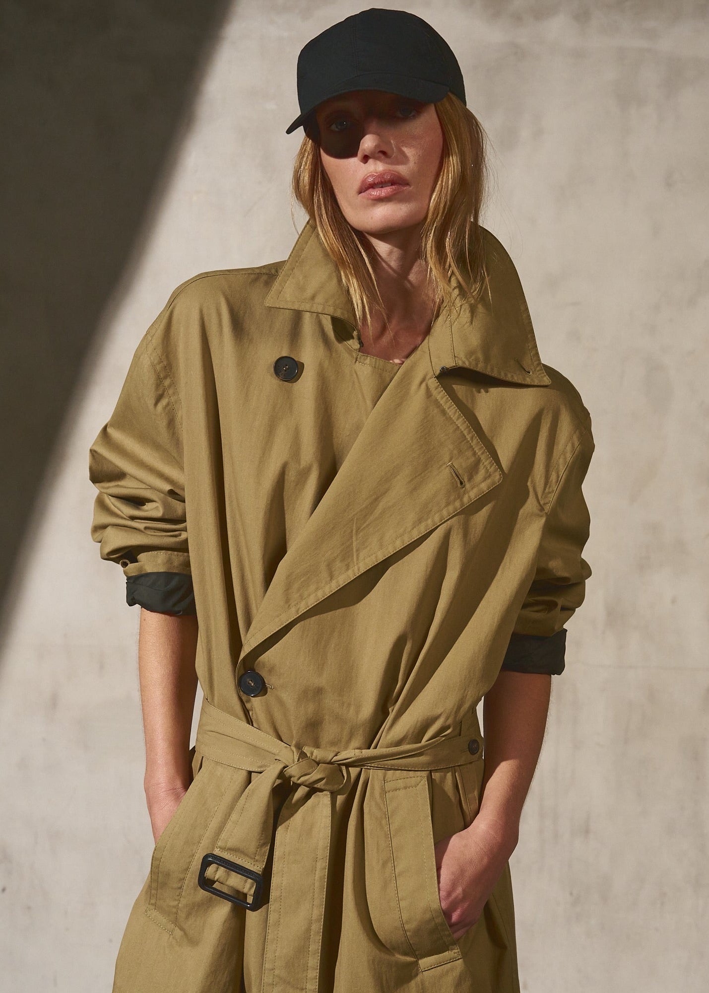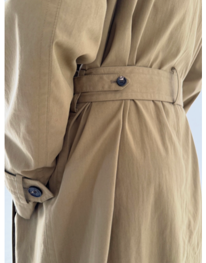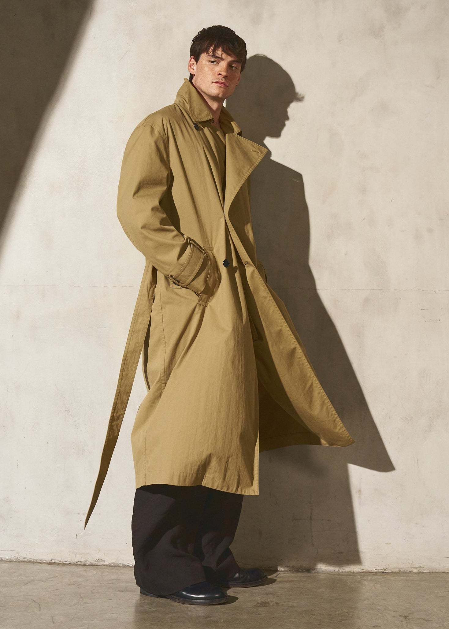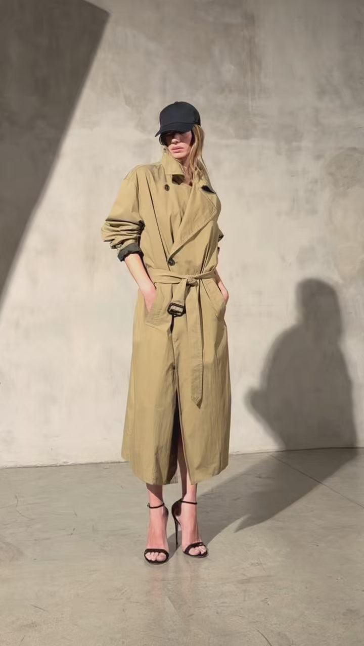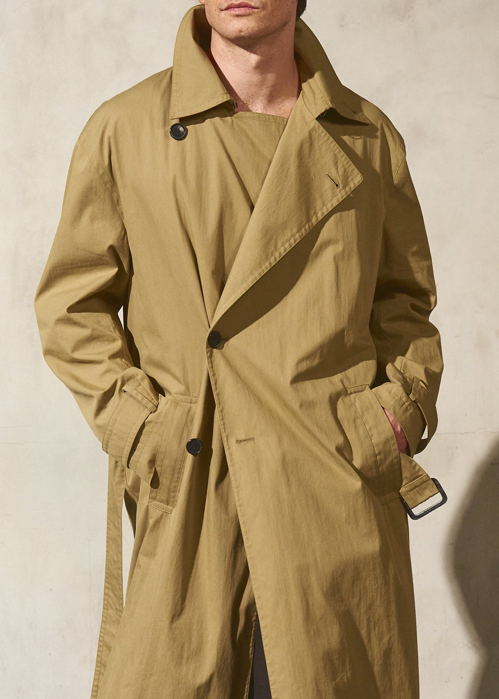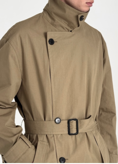 A unisex water resistant Italian trench coat crafted in washed cotton, designed with a pared-back approach to structure and function. The silhouette is refined through restraint, featuring a reduced three button closure that rethinks the traditional trench and allows the fabric and proportion to take focus. Water and wind resistant, with subtle utility details that elevate everyday wear.