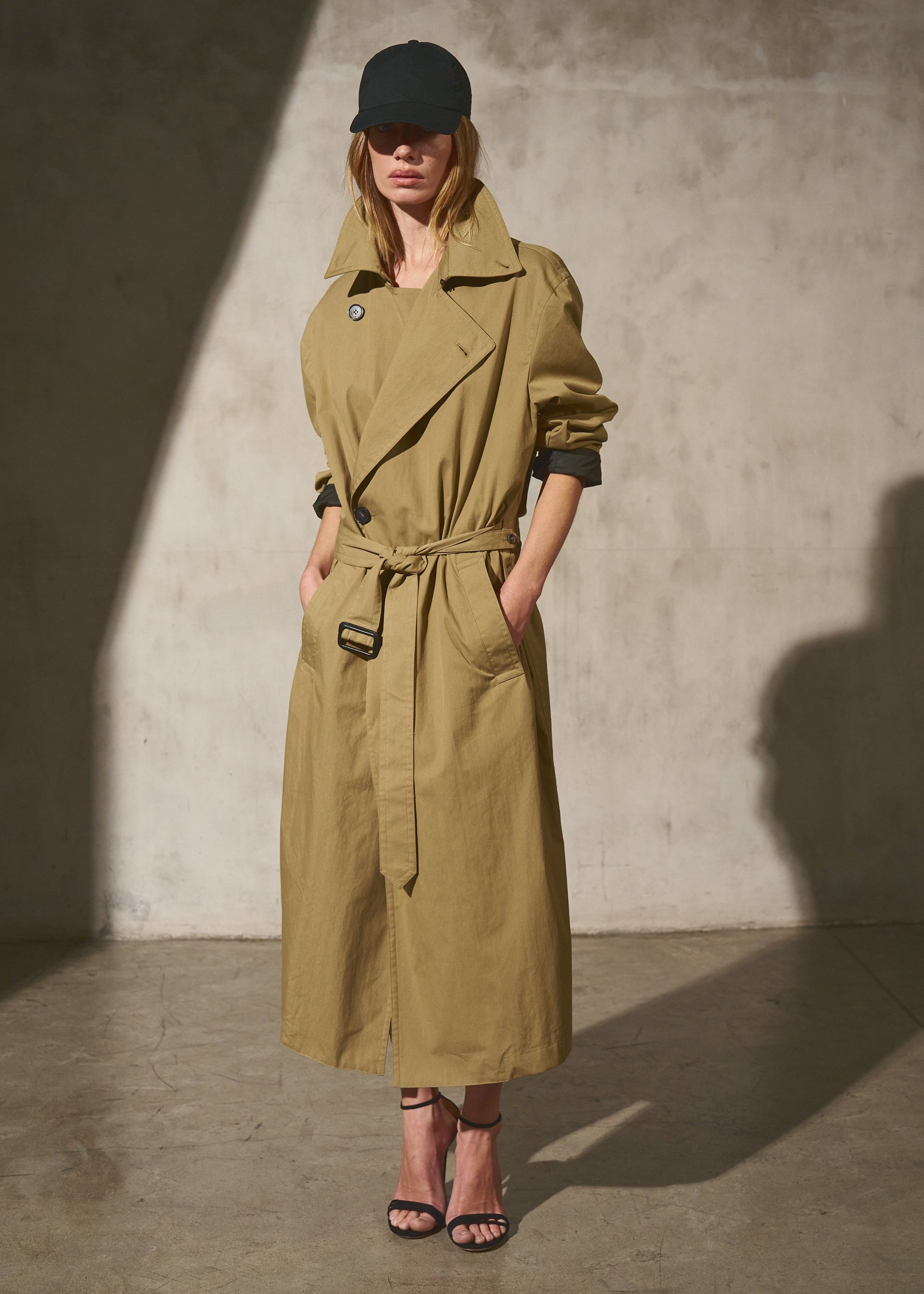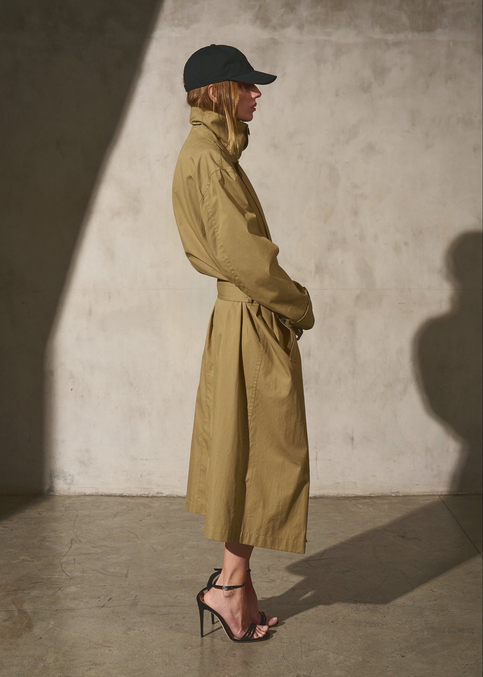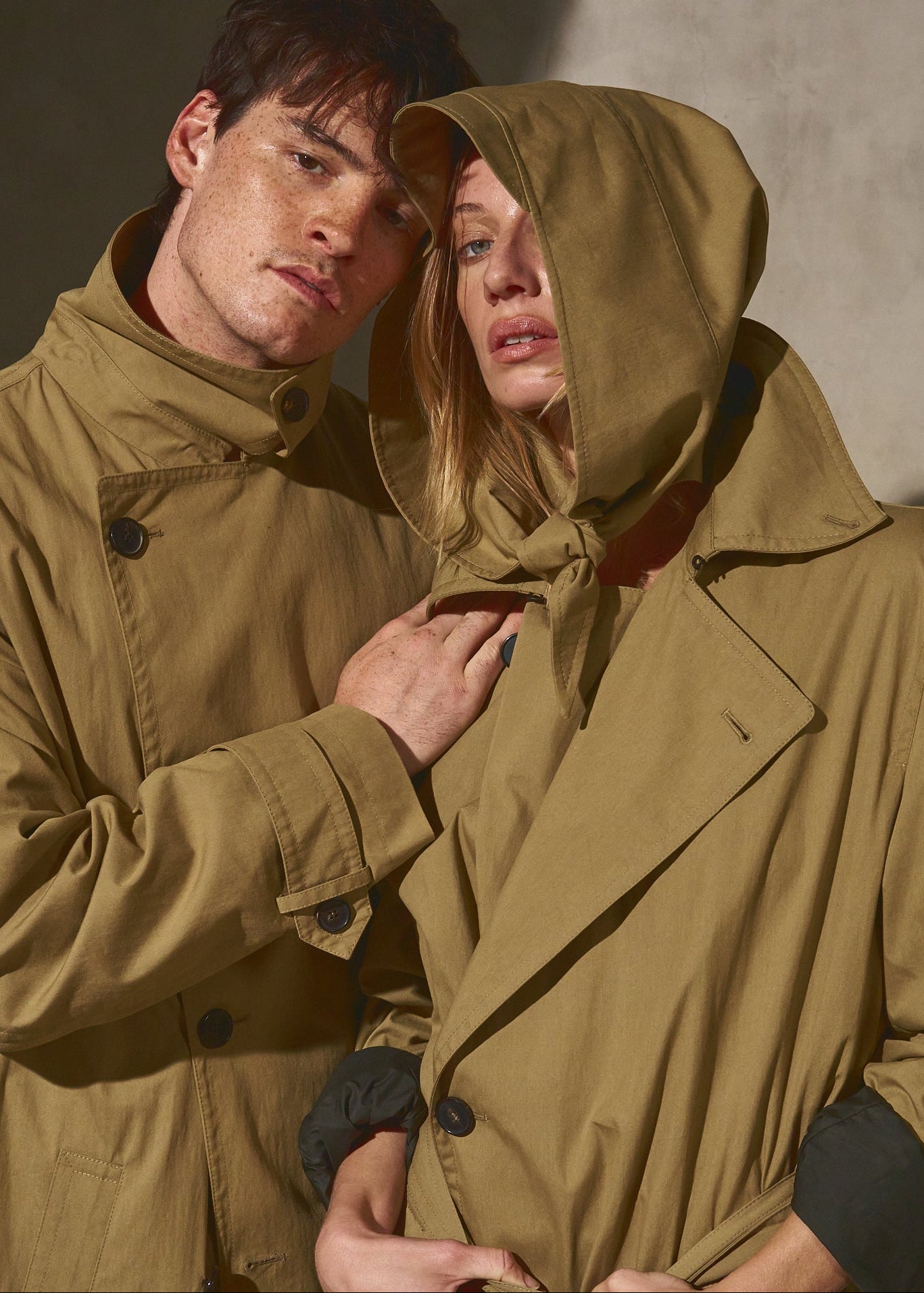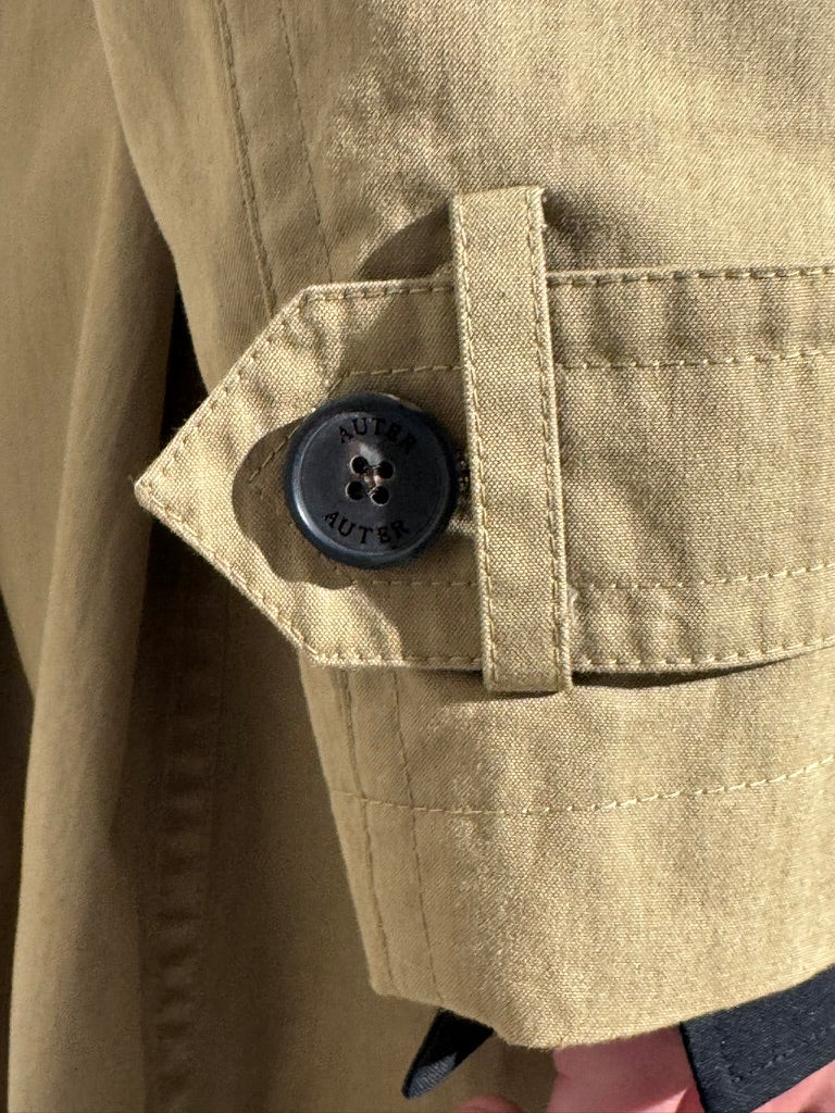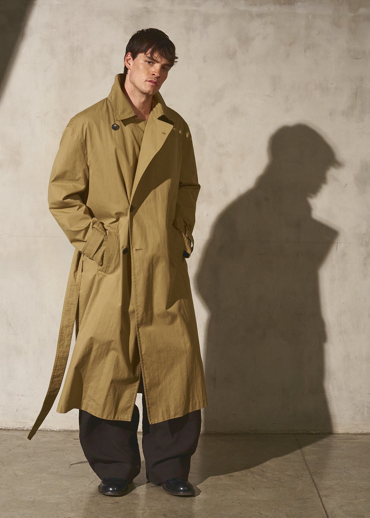 A unisex water resistant Italian trench coat crafted in washed cotton, designed with a pared-back approach to structure and function. The silhouette is refined through restraint, featuring a reduced three button closure that rethinks the traditional trench and allows the fabric and proportion to take focus. Water and wind resistant, with subtle utility details that elevate everyday wear.