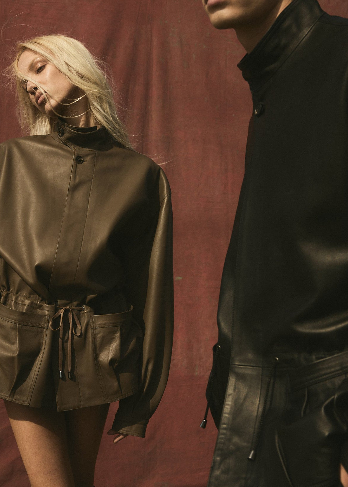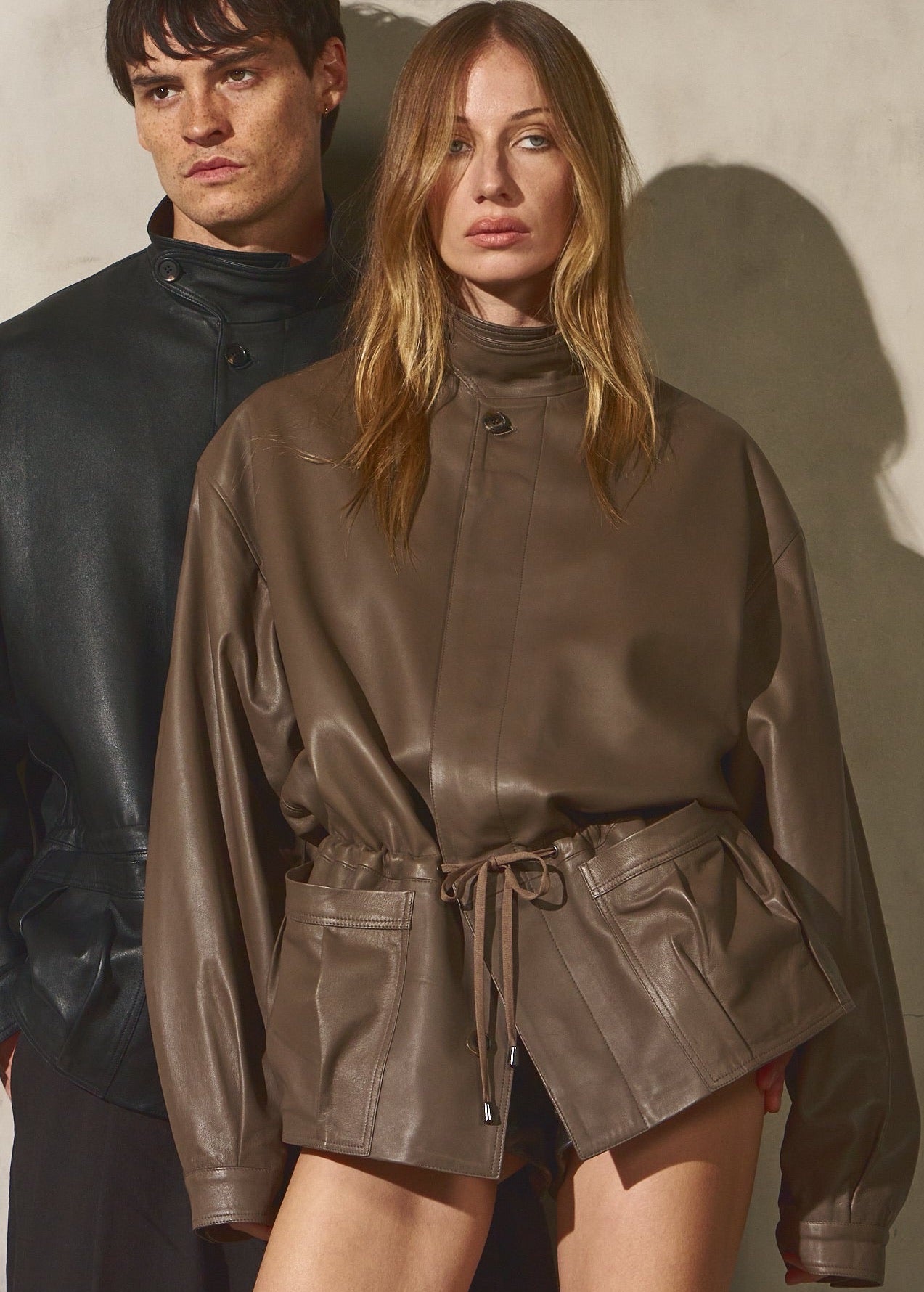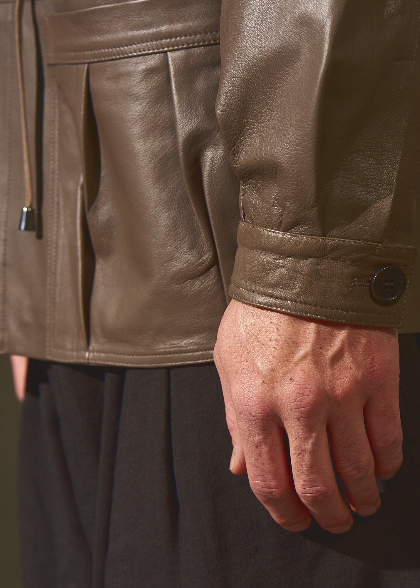 Relaxed fit with effortless drape. The soft Italian leather enhances the silhouette, while the adjustable tie introduces subtle waist definition.