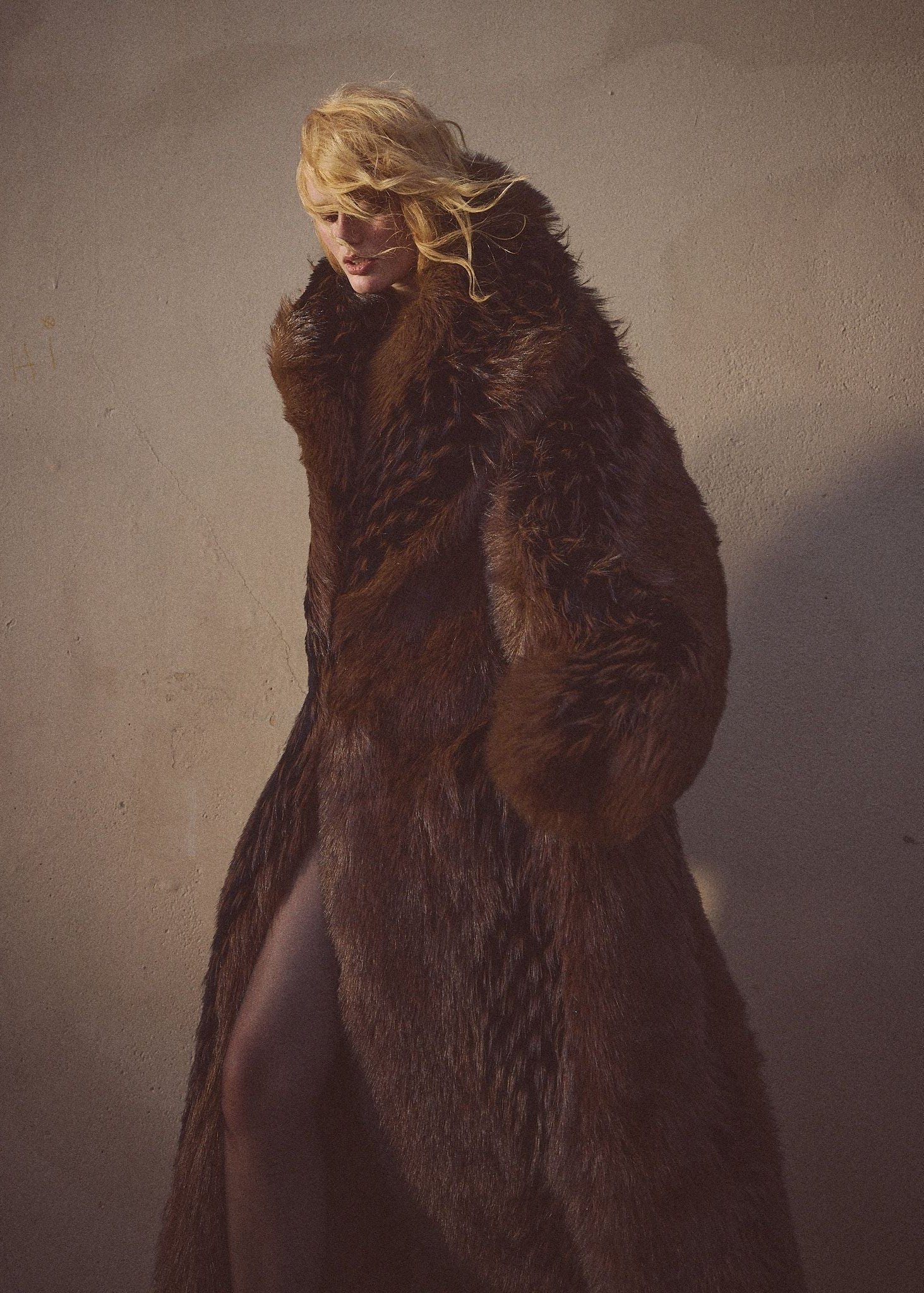 A full-length coat in brown and black faux fur. Designed with an exaggerated shawl collar and sculptural volume for a look that’s bold, tactile, and unmistakably refined.