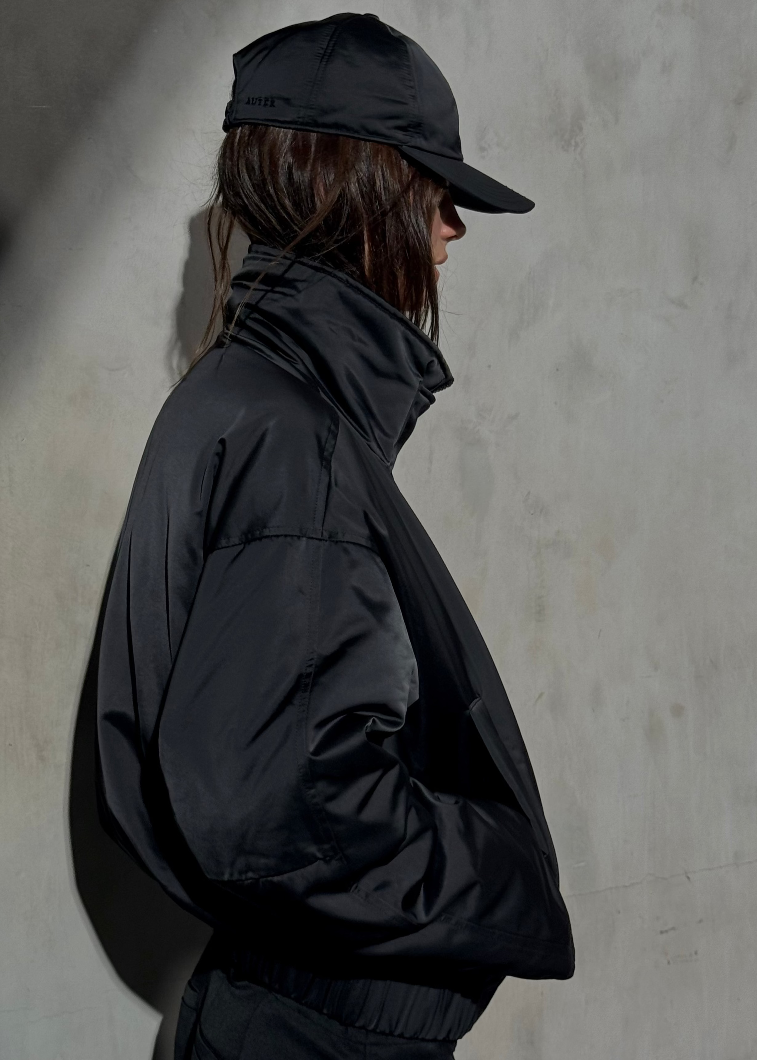 Modern and sculptural, this cropped down bomber is crafted from water and wind resistant matte sateen with a soft sheen. Designed with voluminous sleeves, a wide collar, and modern style.