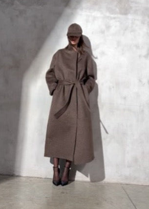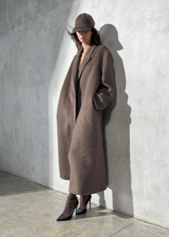 An Oversized, long, unlined overcoat crafted from a double-faced mohair wool blend. Defined by a clean silhouette with dropped shoulders, a sharp notch collar, and a fluid robe-style belt closure.