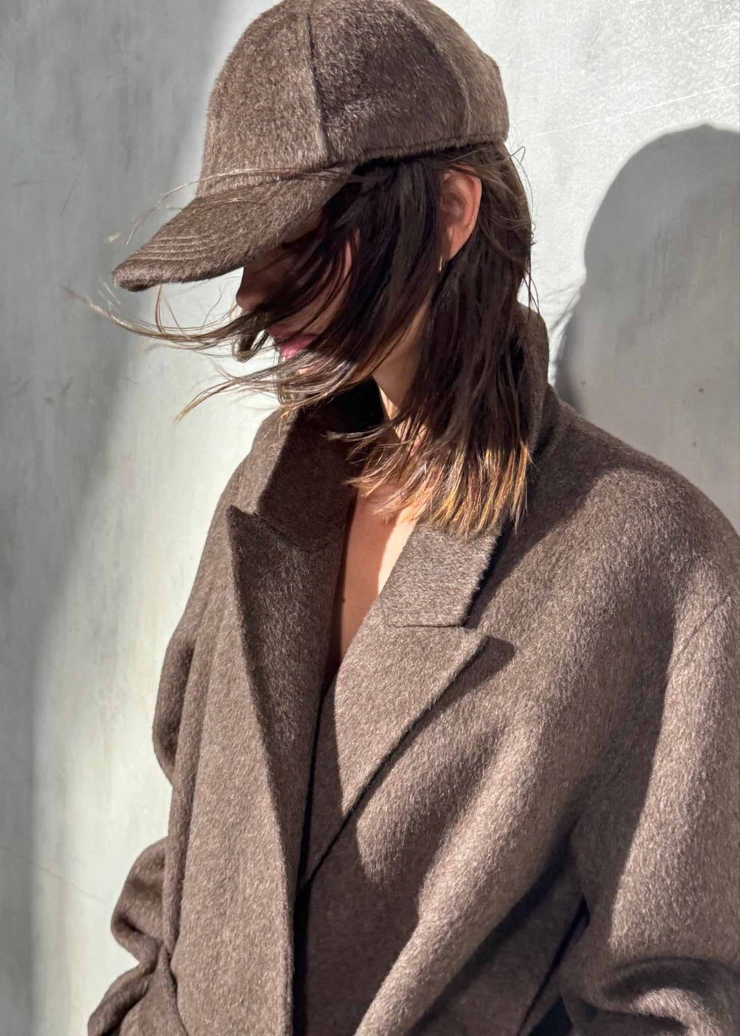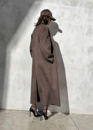 This Oversized fit coat drapes with quiet structure and movement. The unlined interior emphasizes softness and flow, creating a natural warmth ideal for layering.