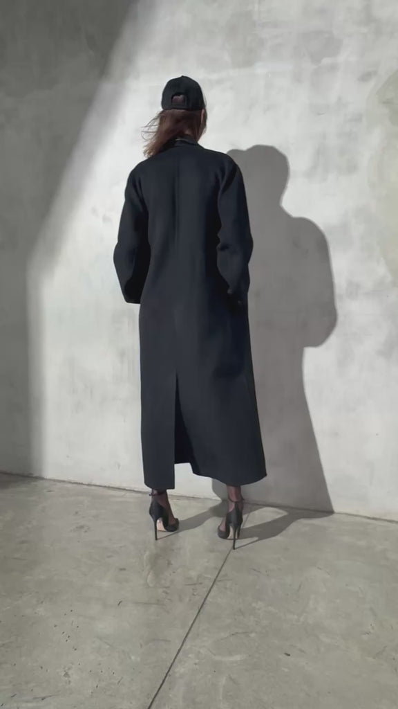 An unlined Oversized topcoat in double-faced cashmere wool—fluid, elongated, and deliberately understated.