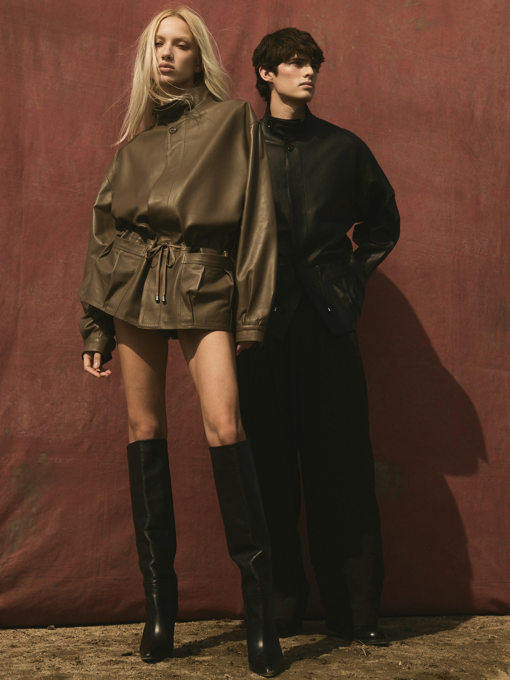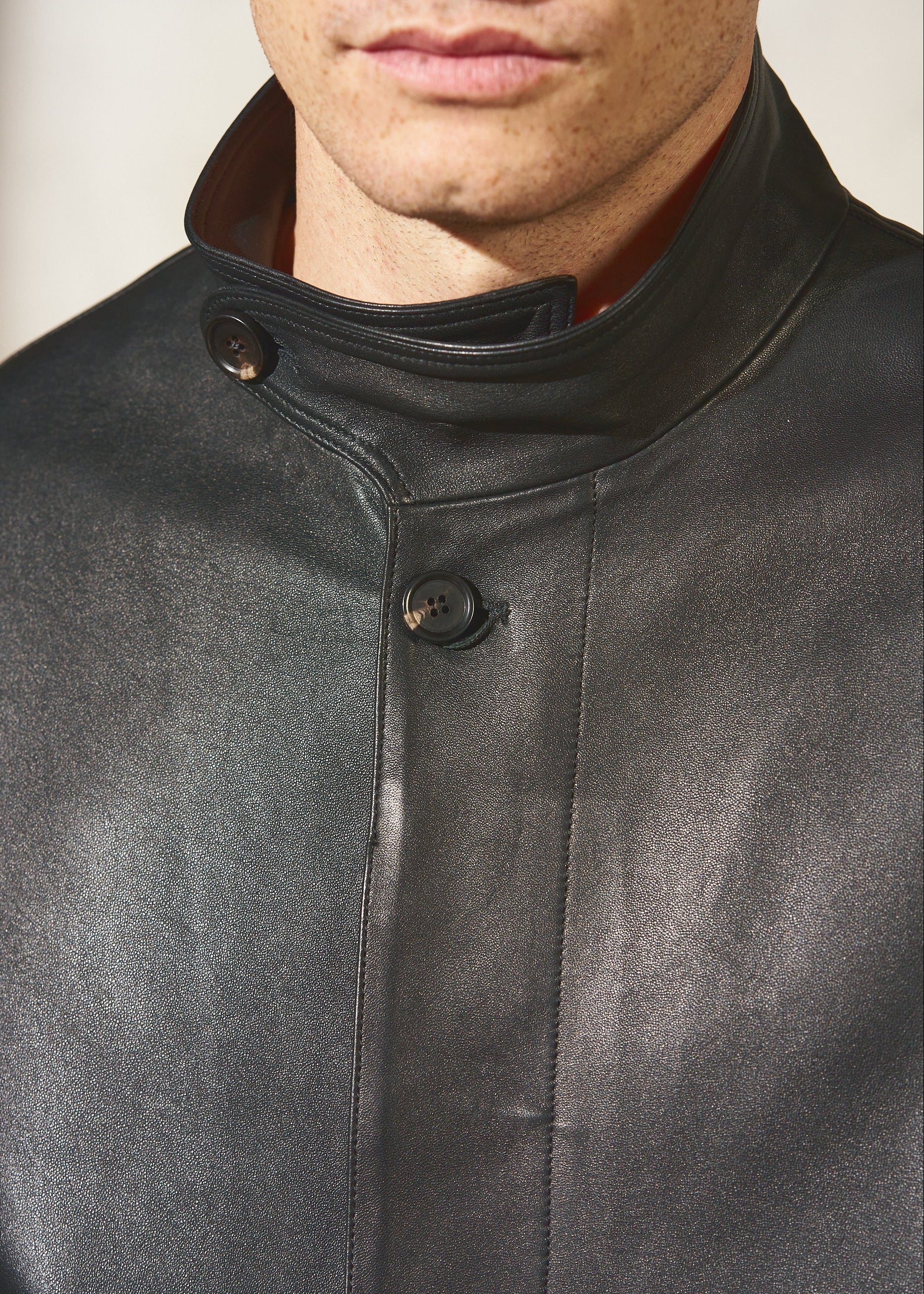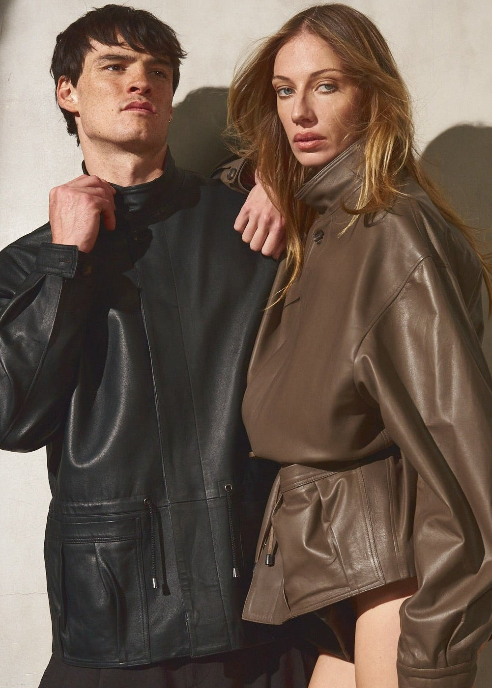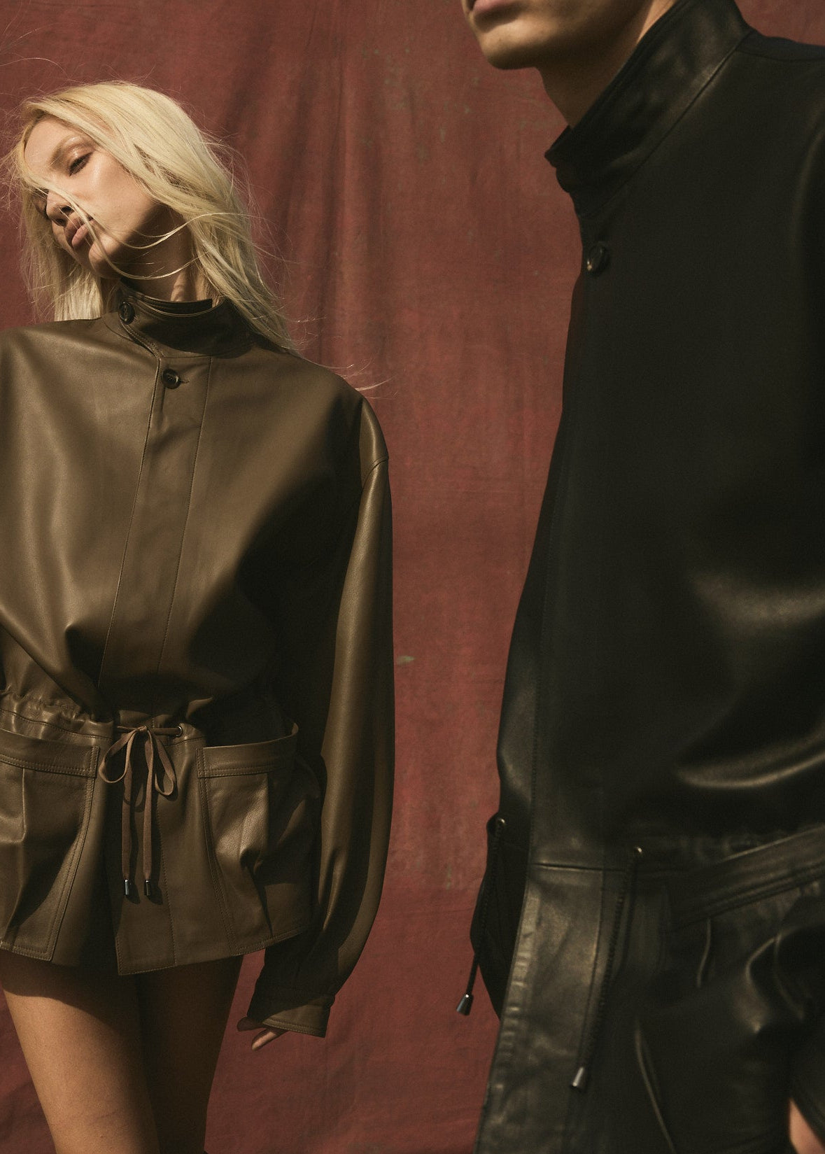 Relaxed fit with effortless drape. The soft Italian leather enhances the silhouette, while the adjustable tie introduces subtle waist definition.