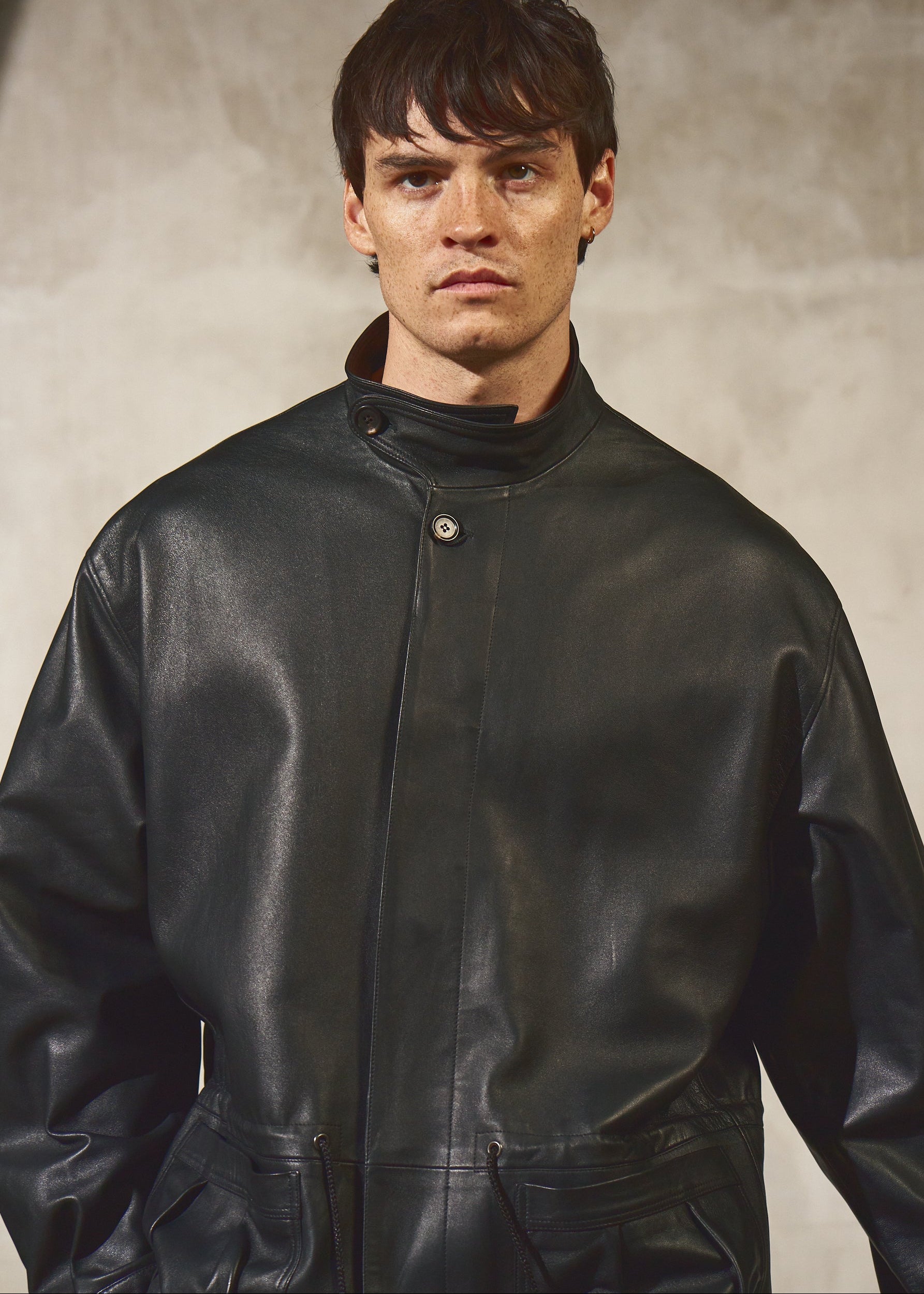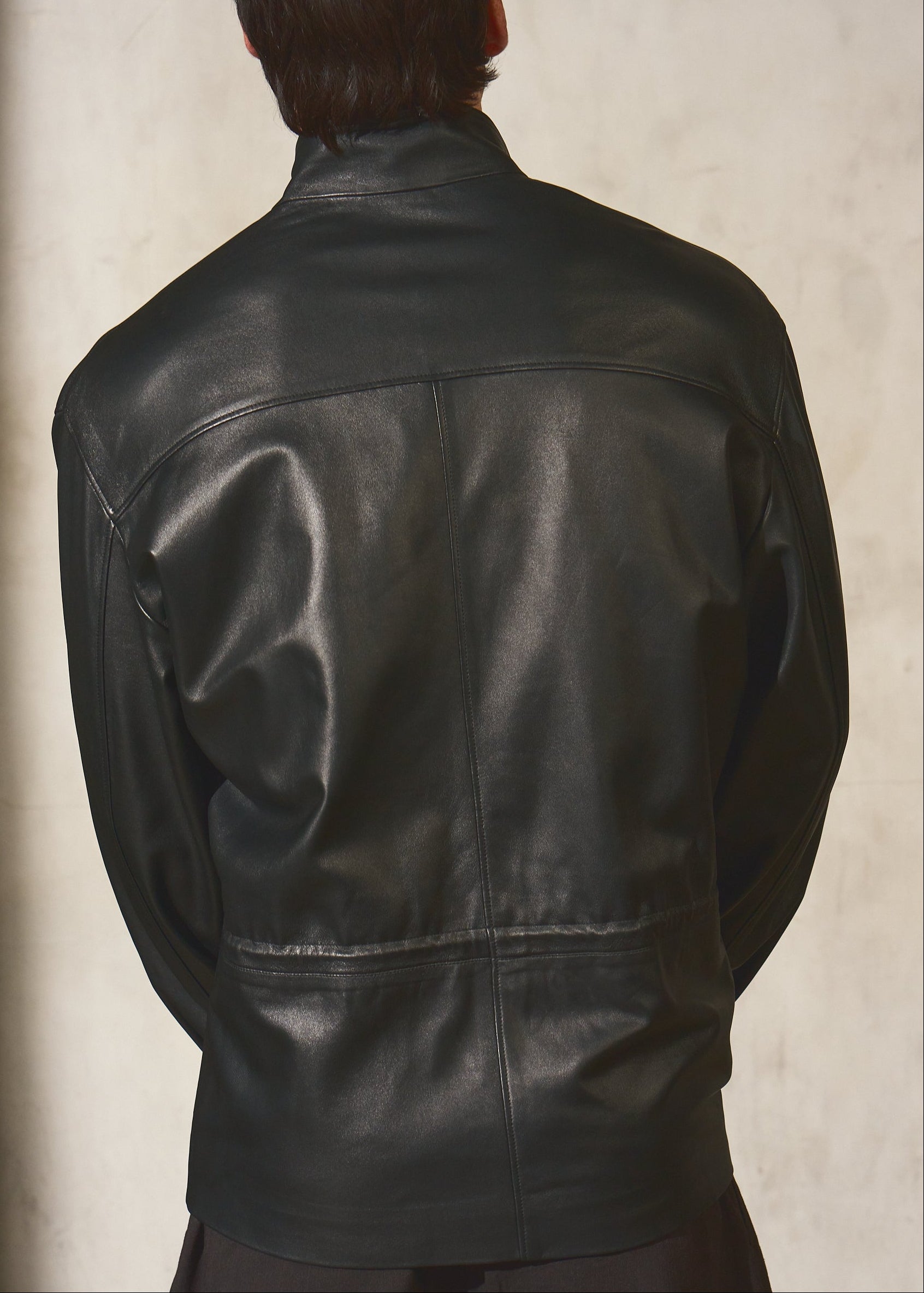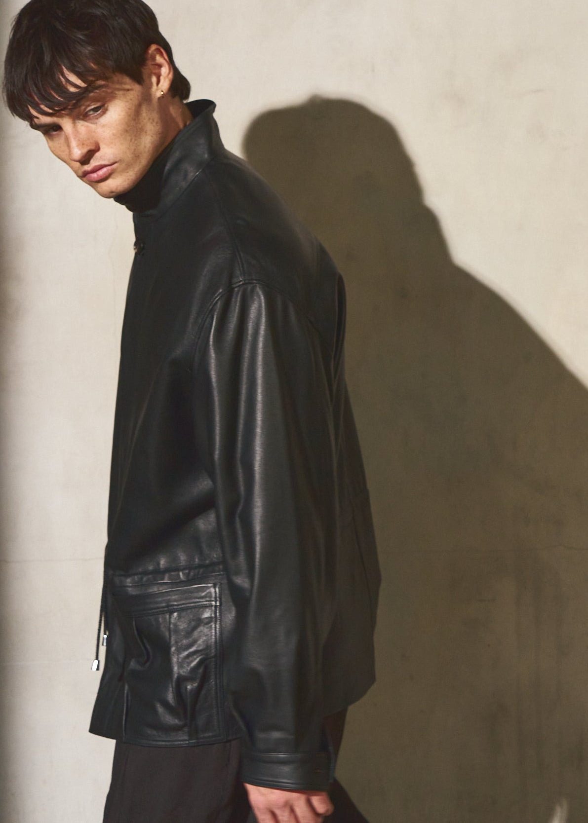 Crafted from Italian leather, this lightweight unisex jacket is defined by dropped shoulders and an internal waist drawstring that cinches the silhouette into a soft blouson shape. A hidden placket keeps the front streamlined, while oversized patch pockets introduce quiet utility.