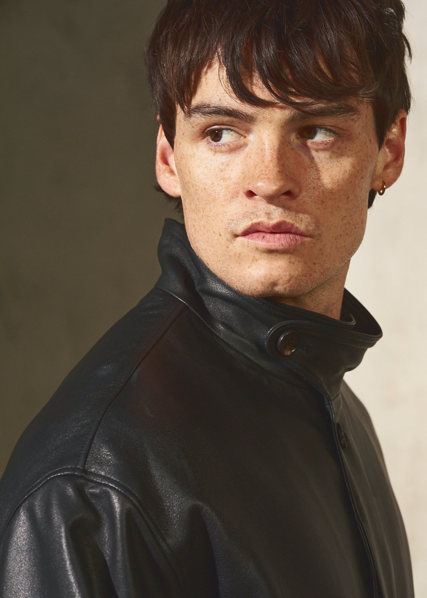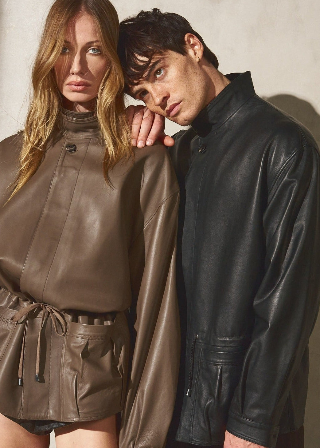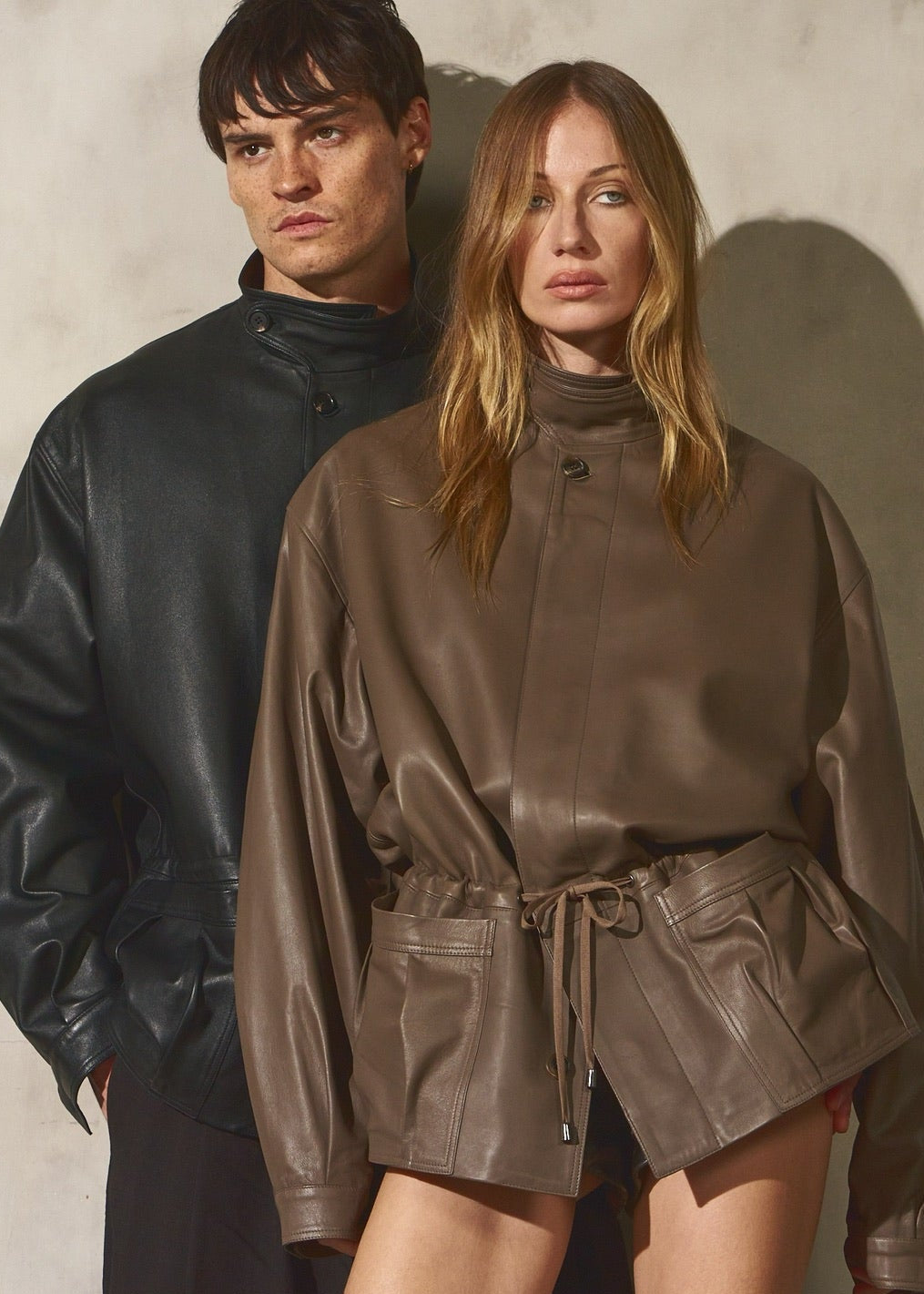 Crafted from Italian leather, this lightweight unisex jacket is defined by dropped shoulders and an internal waist drawstring that cinches the silhouette into a soft blouson shape. A hidden placket keeps the front streamlined, while oversized patch pockets introduce quiet utility.