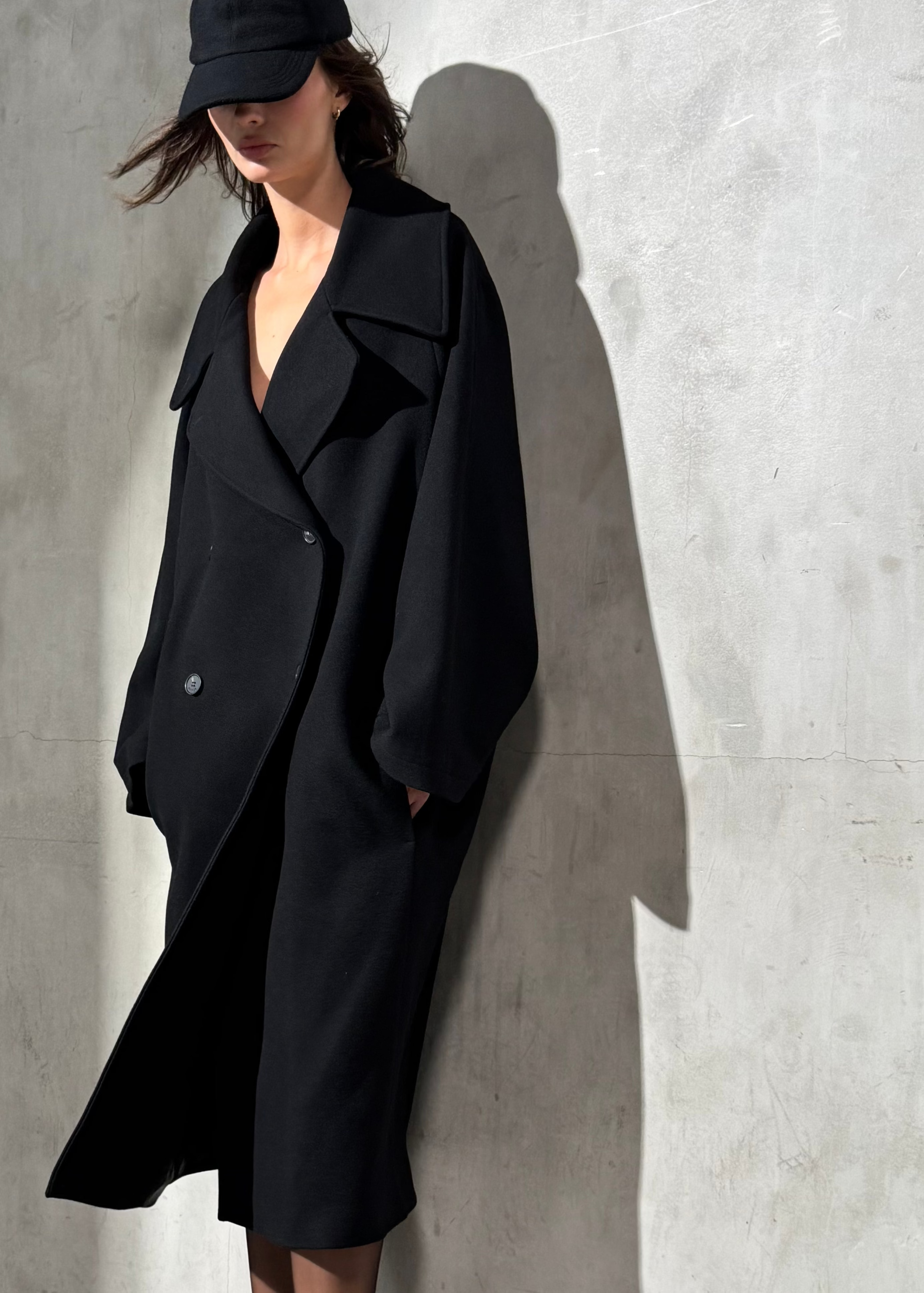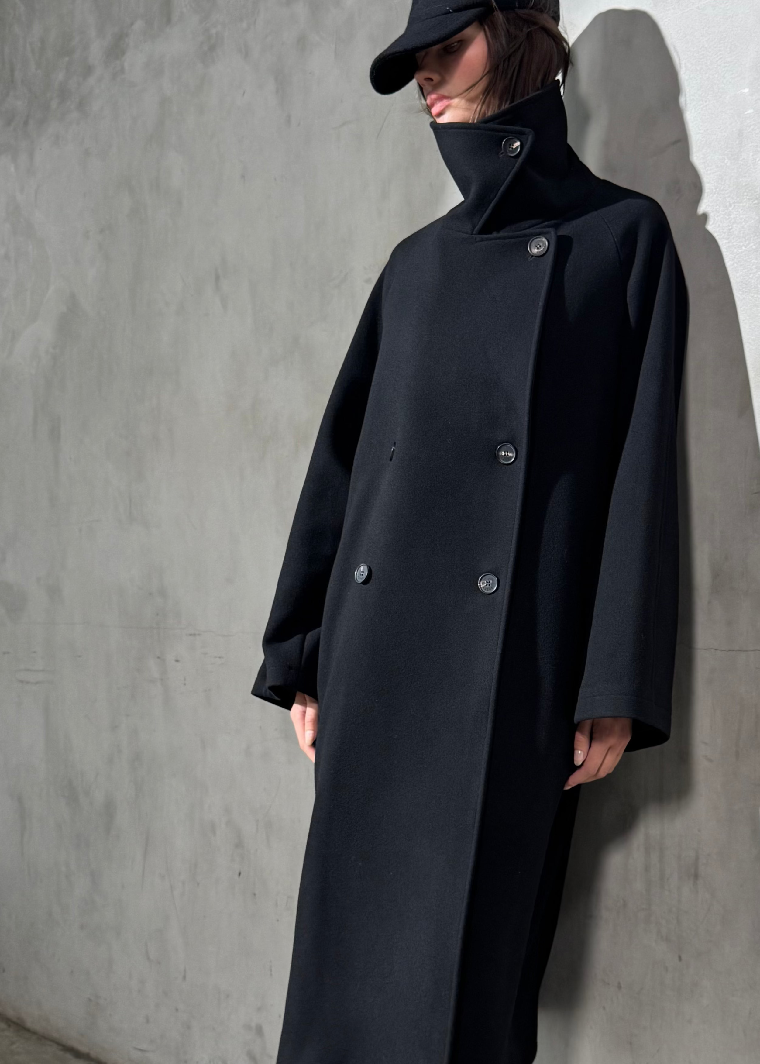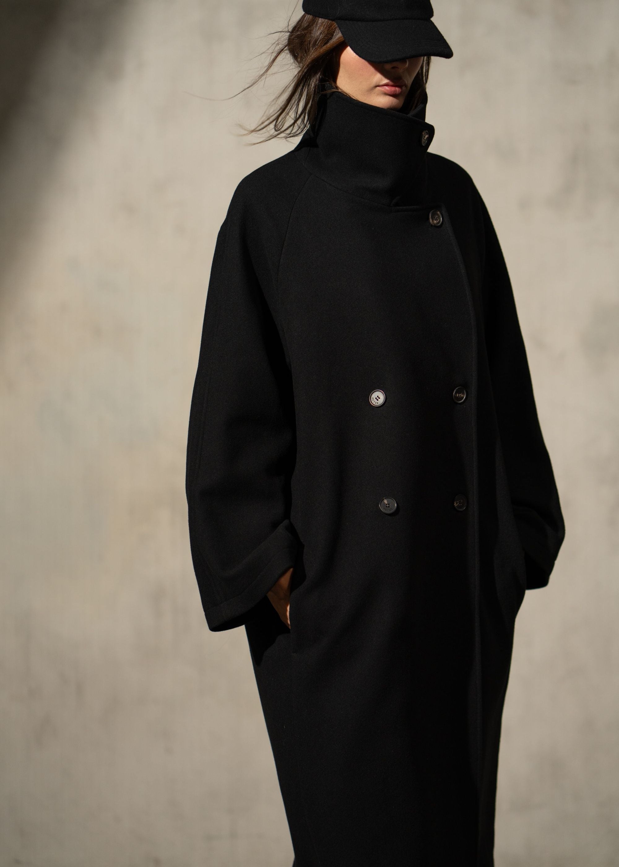 An elongated reinterpretation of the peacoat, crafted from double-faced Italian wool with a high buttoned collar and sculptural cocoon silhouette. Falls to mid-calf with soft volume and sophisticated movement.