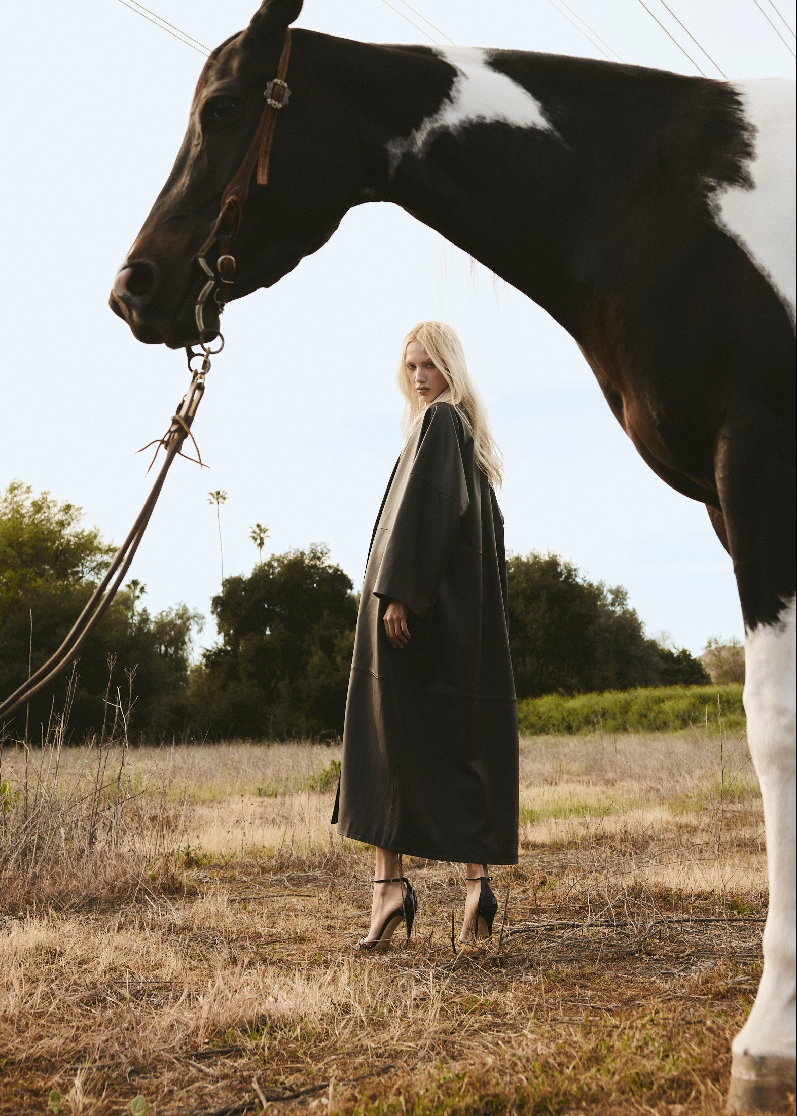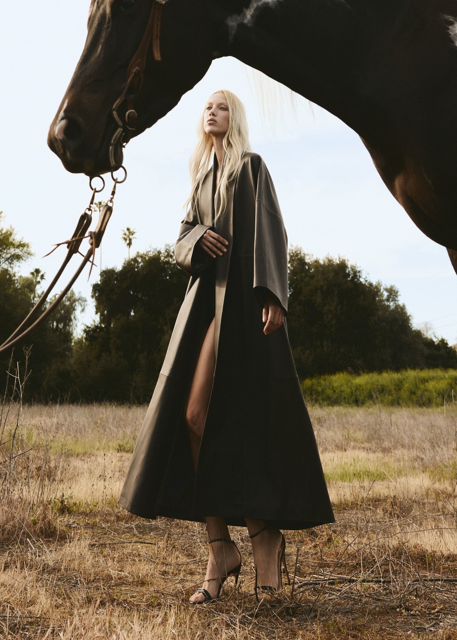 Relaxed fit with fluid drape. The leather enhances movement while maintaining a composed, architectural presence.