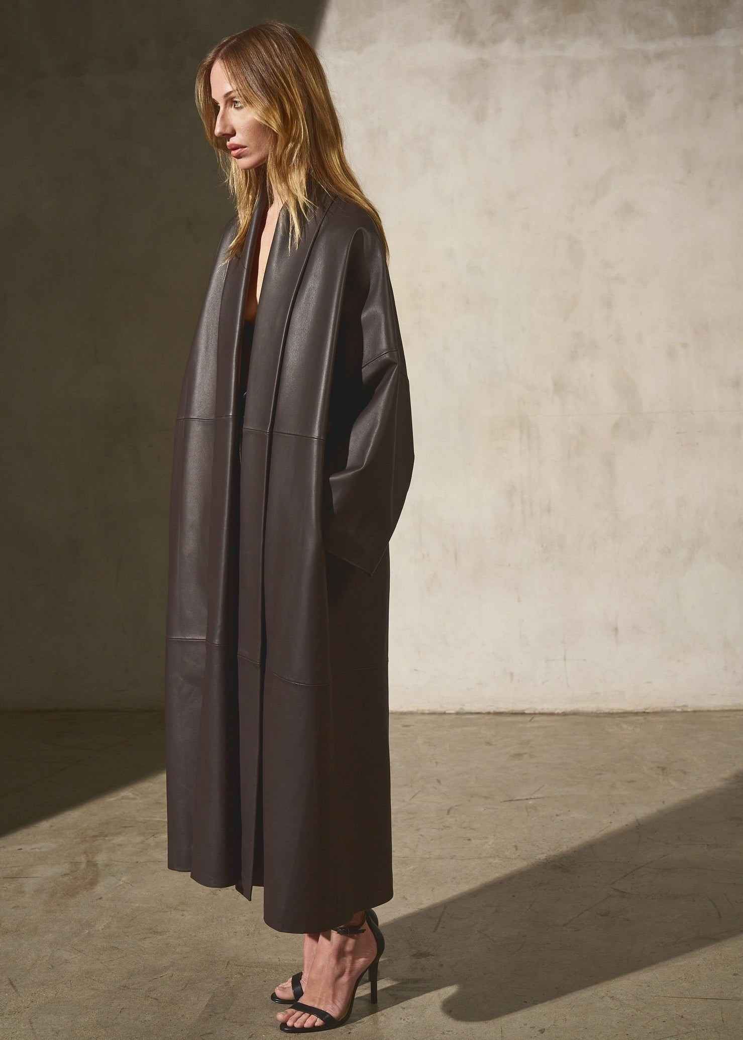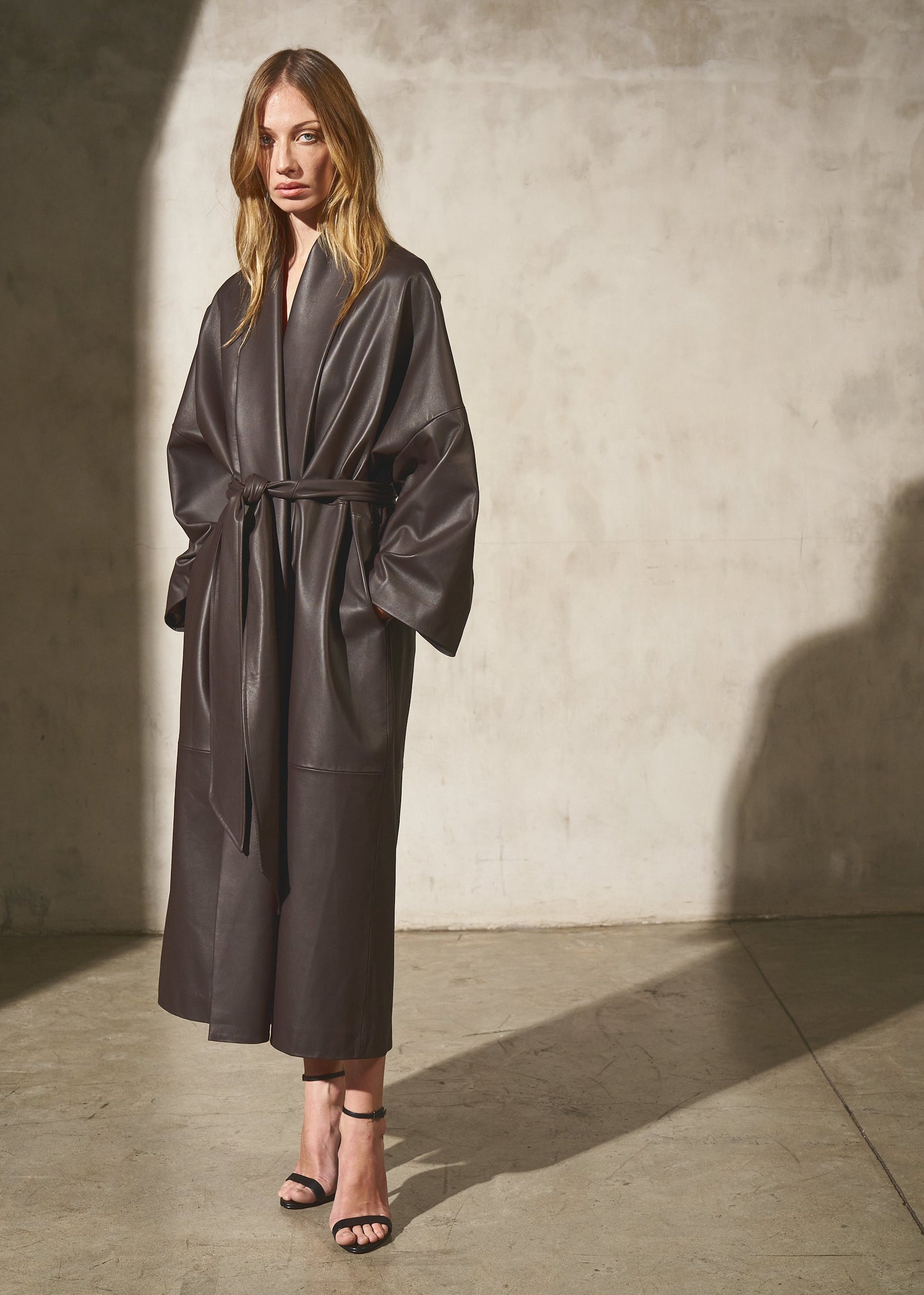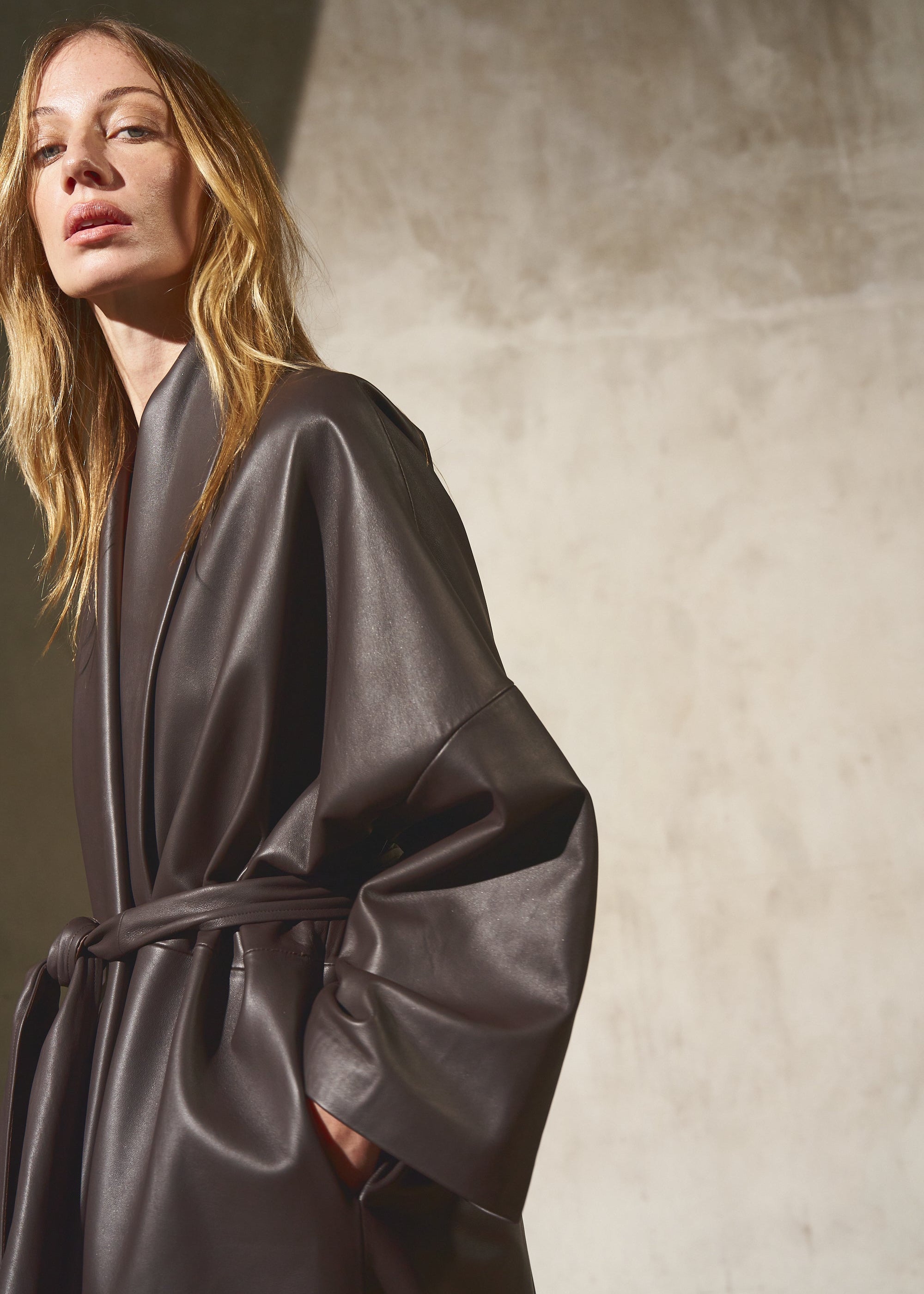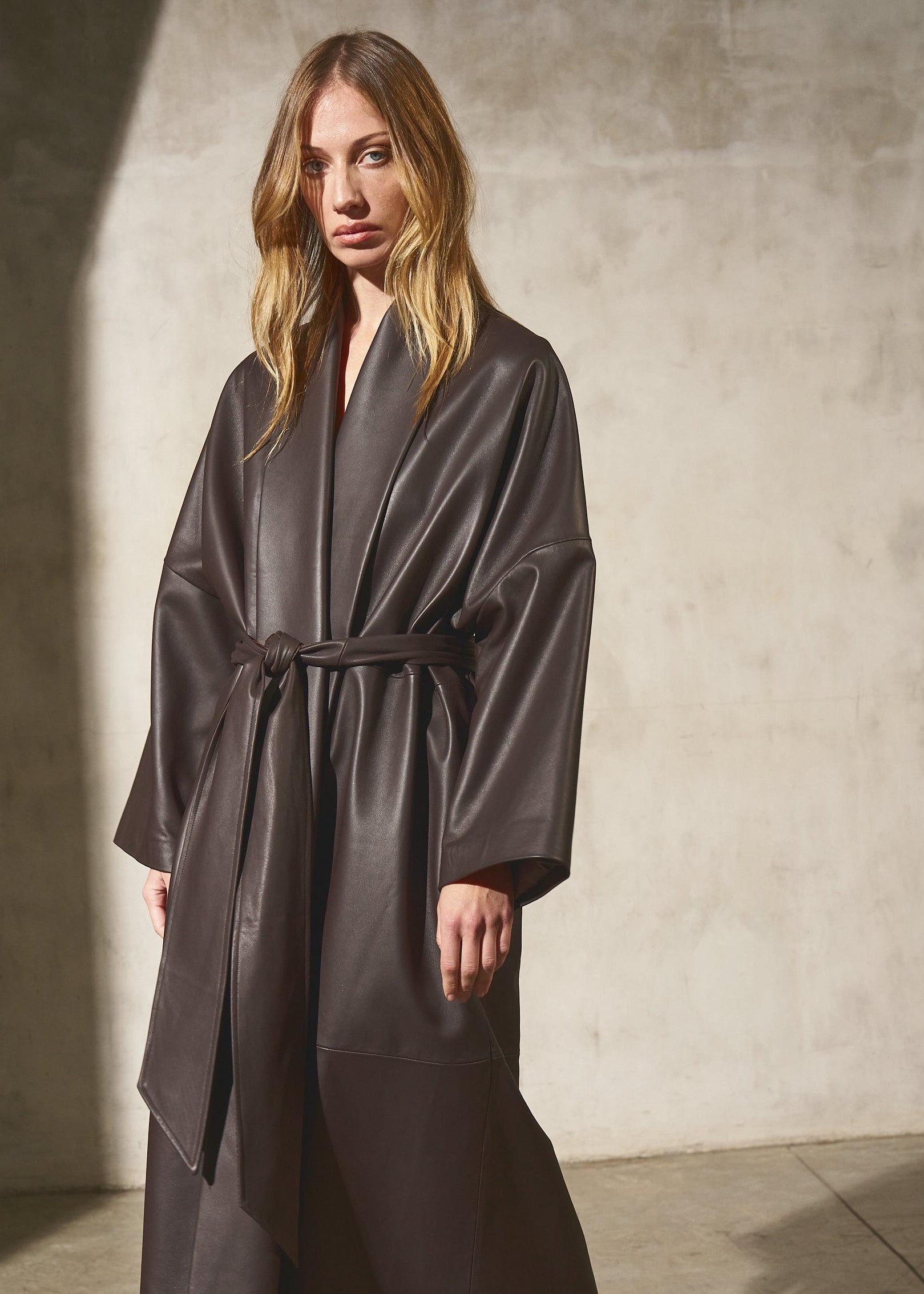 A luxurious leather wrap coat defined by structural ease. Cut in a kimono-inspired silhouette, dropped shoulders and winged sleeves create fluid movement through the arms, while a self-tie belt allows adjustable shaping to the body. Clean lines and refined proportion balance softness with structure.