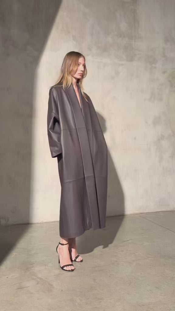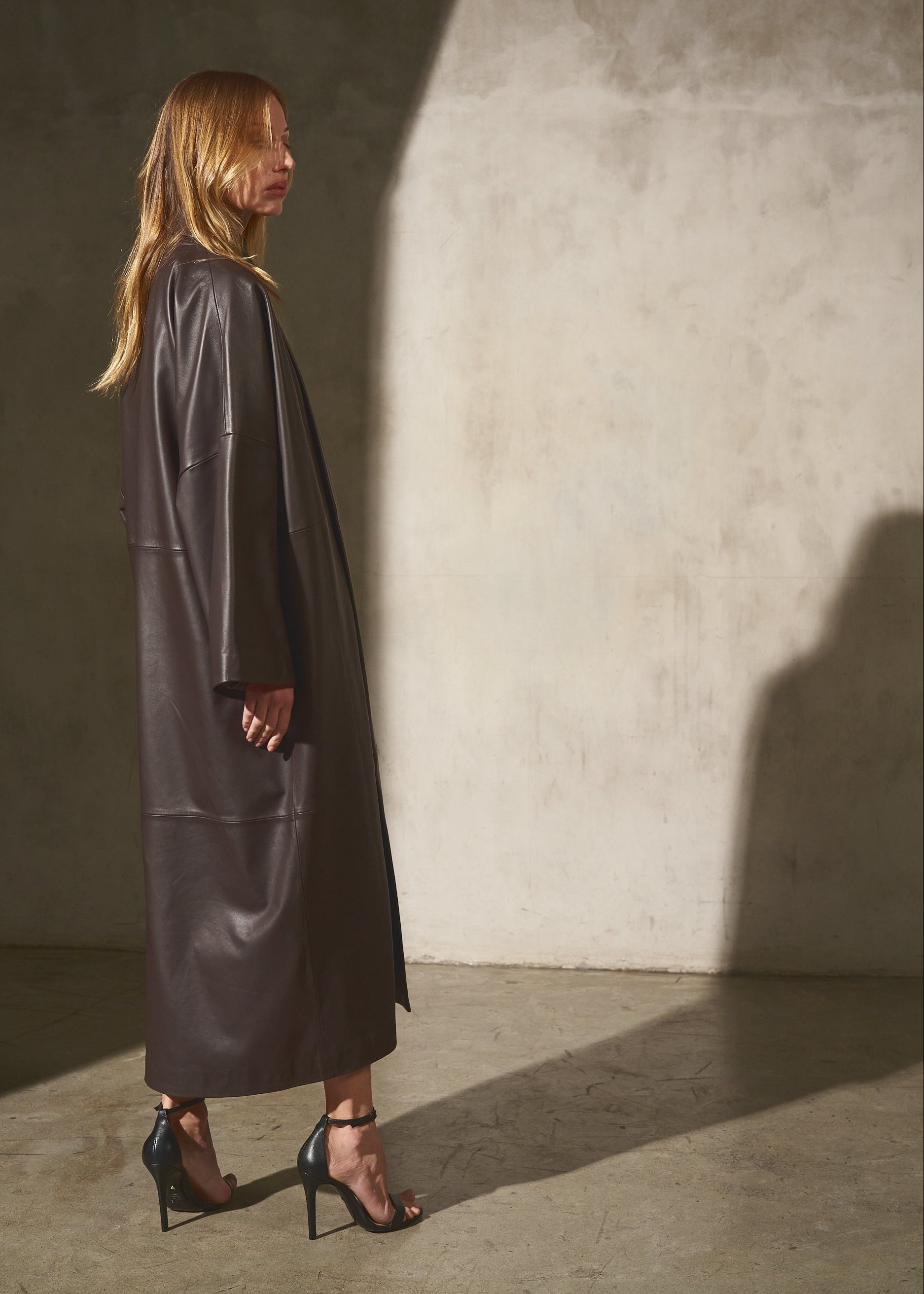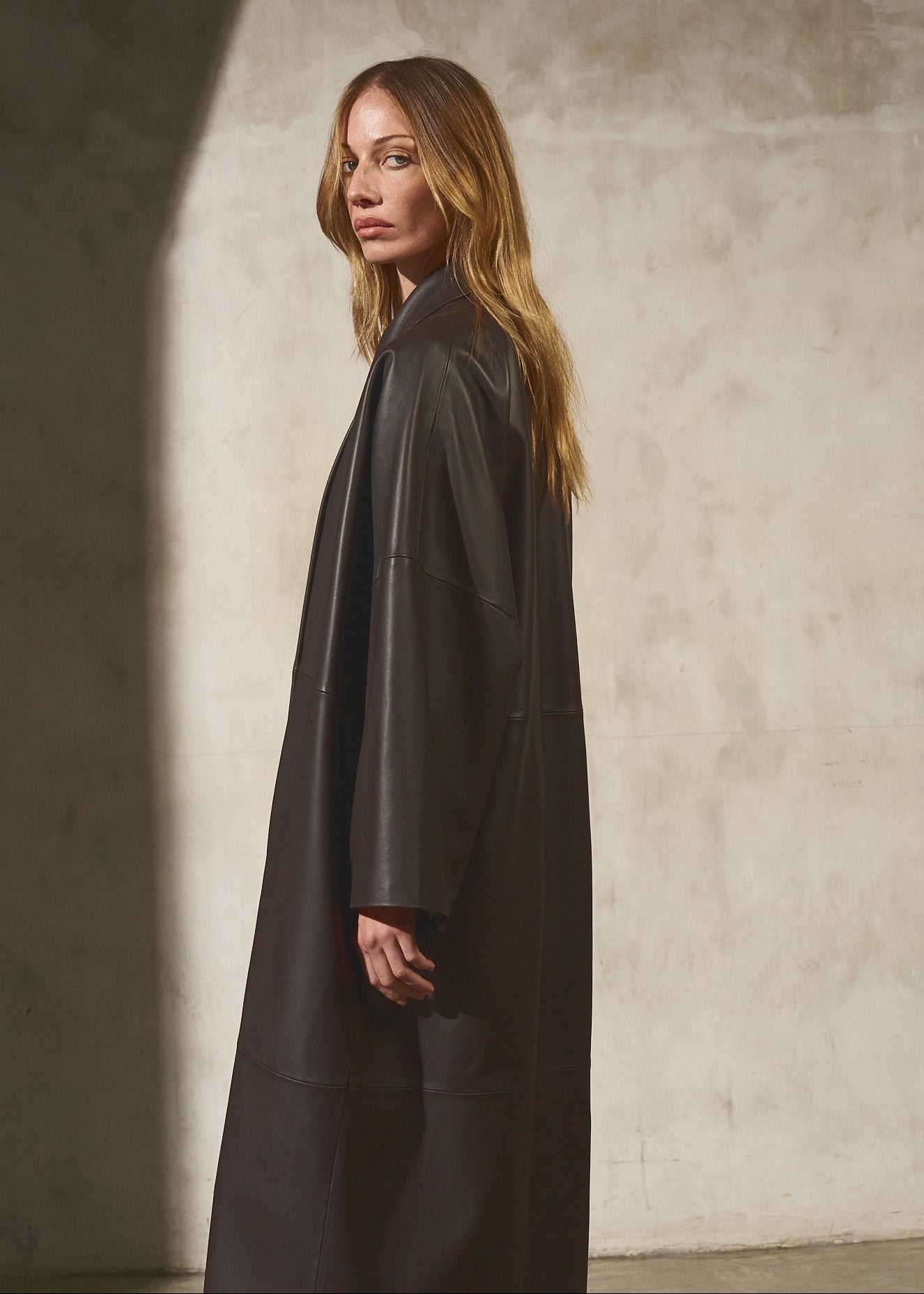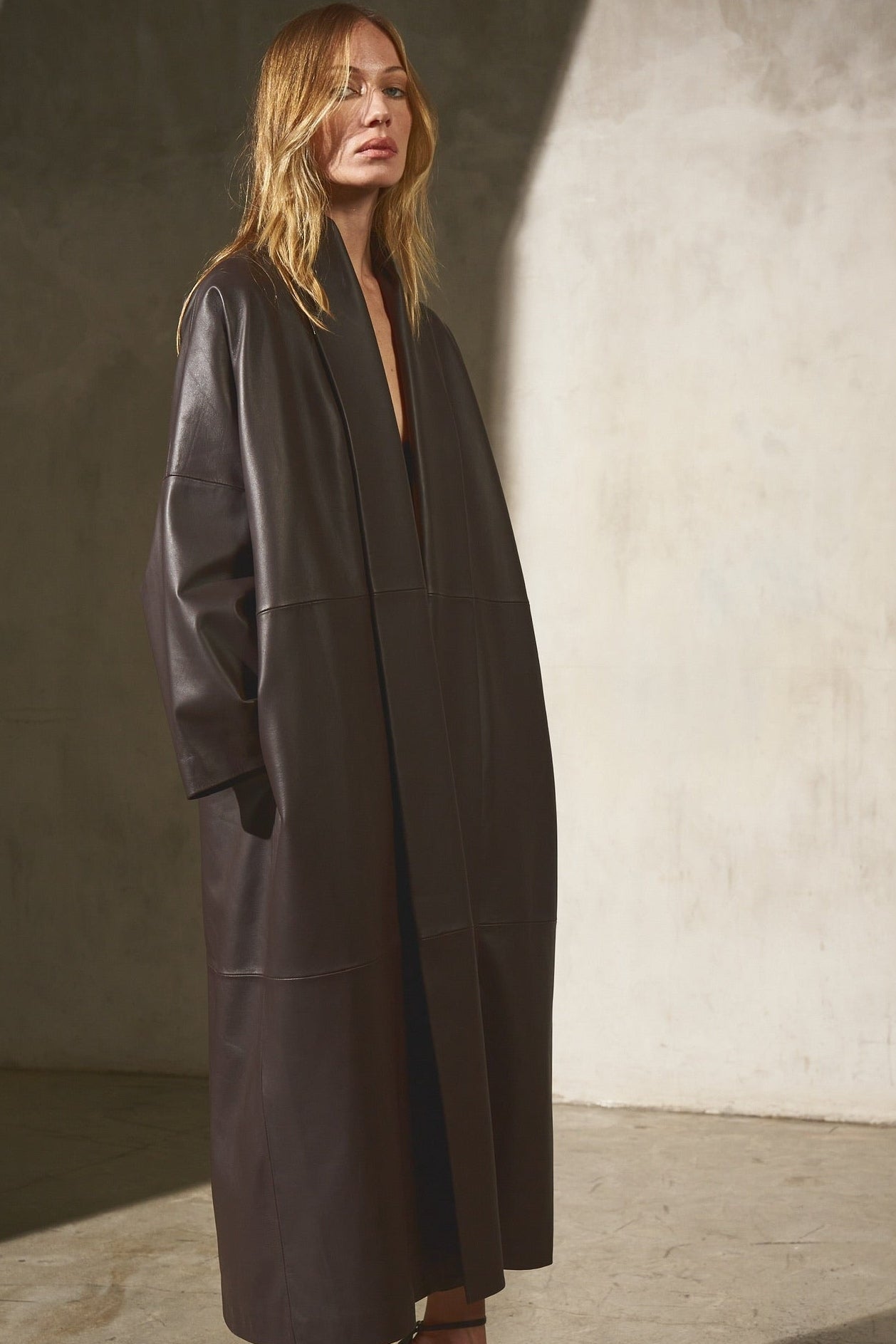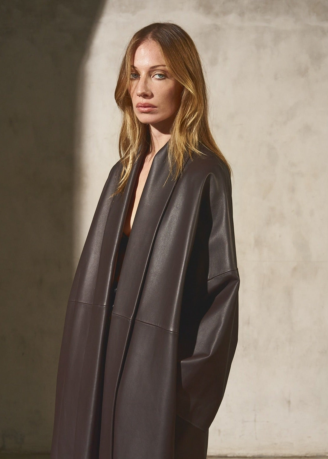 A luxurious leather wrap coat defined by structural ease. Cut in a kimono-inspired silhouette, dropped shoulders and winged sleeves create fluid movement through the arms, while a self-tie belt allows adjustable shaping to the body. Clean lines and refined proportion balance softness with structure.